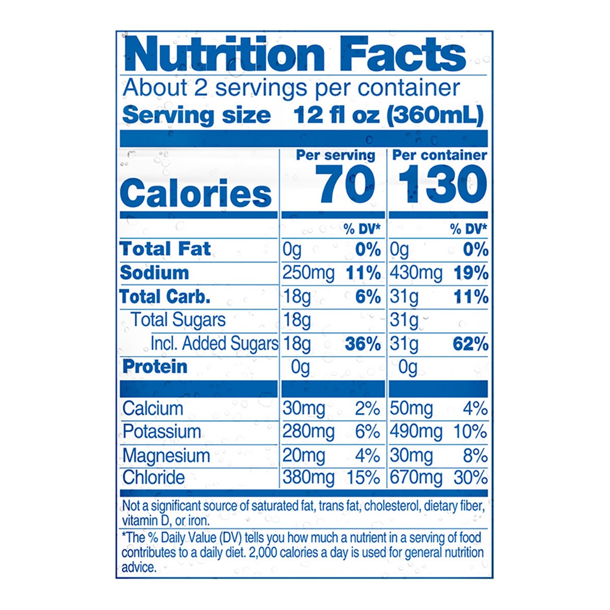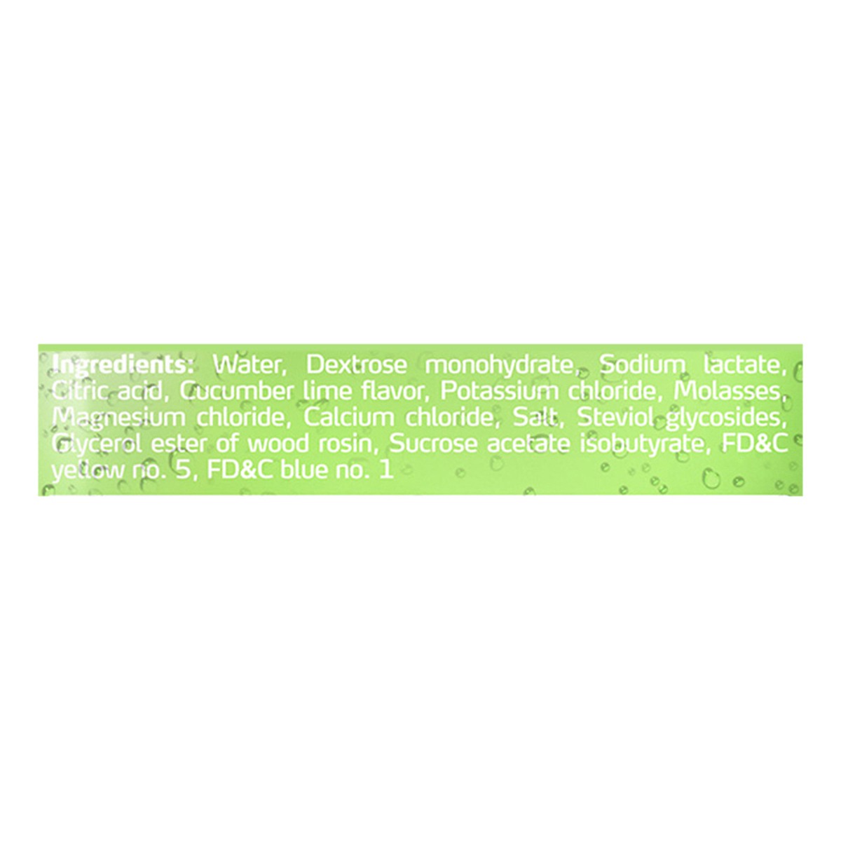 WATER, DEXTROSE MONOHYDRATE, CONTAINS 2% OR LESS OF: SODIUM LACTATE, CITRIC ACID, CUCUMBER & LEMON FLAVOR, POTASSIUM CHLORISE, MOLASSES, MAGNESIUM CHLORIDE, CALCIUM CHOLRIDE, SALT, STEVIA GLYCOSIDES, …