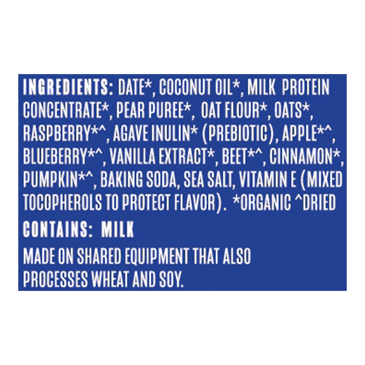 Date*, Coconut Oil*, Milk Protein Concentrate*, Pear Puree*, Oat Flour*, Oats*, Raspberry*^, Agave Inulin* (Prebiotic), Apple*^, Blueberry*^, Vanilla Extract*, Beet*^, Cinnamon*, Pumpkin*^, Baking Sod…