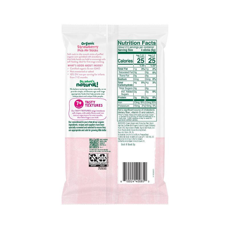 Little Bellies Baby Bellies Organic Strawberry Pick-Me Sticks from our Tasty Textures range are deliciously crisp organic puffed corn snacks, lightly sprinkled with strawberry, which gently melt in th…