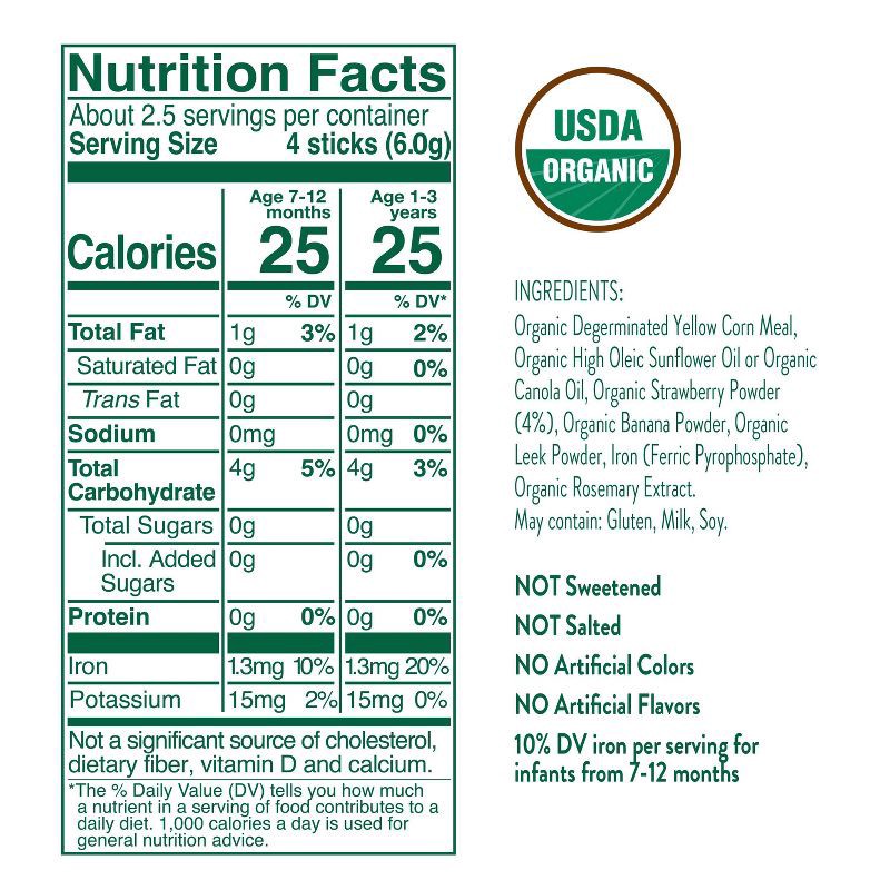 Organic Degerminated Yellow Corn Meal, Organic High Oleic Sunflower Oil or Organic Canola Oil, Organic Strawberry Powder (4%), Organic Banana Powder, Organic Leek Powder, Iron (Ferric Pyrophosphate), …