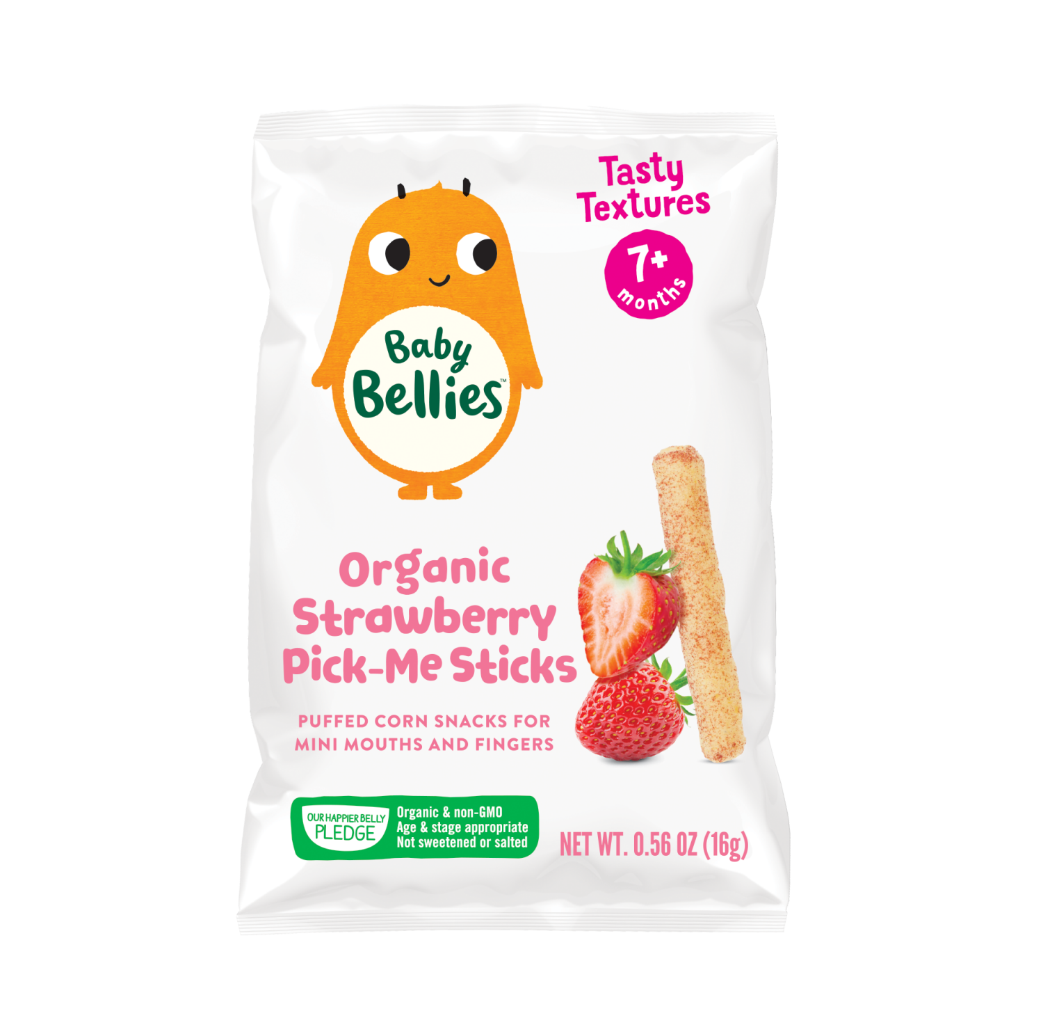 Little Bellies Baby Bellies Organic Strawberry Pick-Me Sticks from our Tasty Textures range are deliciously crisp organic puffed corn snacks, lightly sprinkled with strawberry, which gently melt in th…