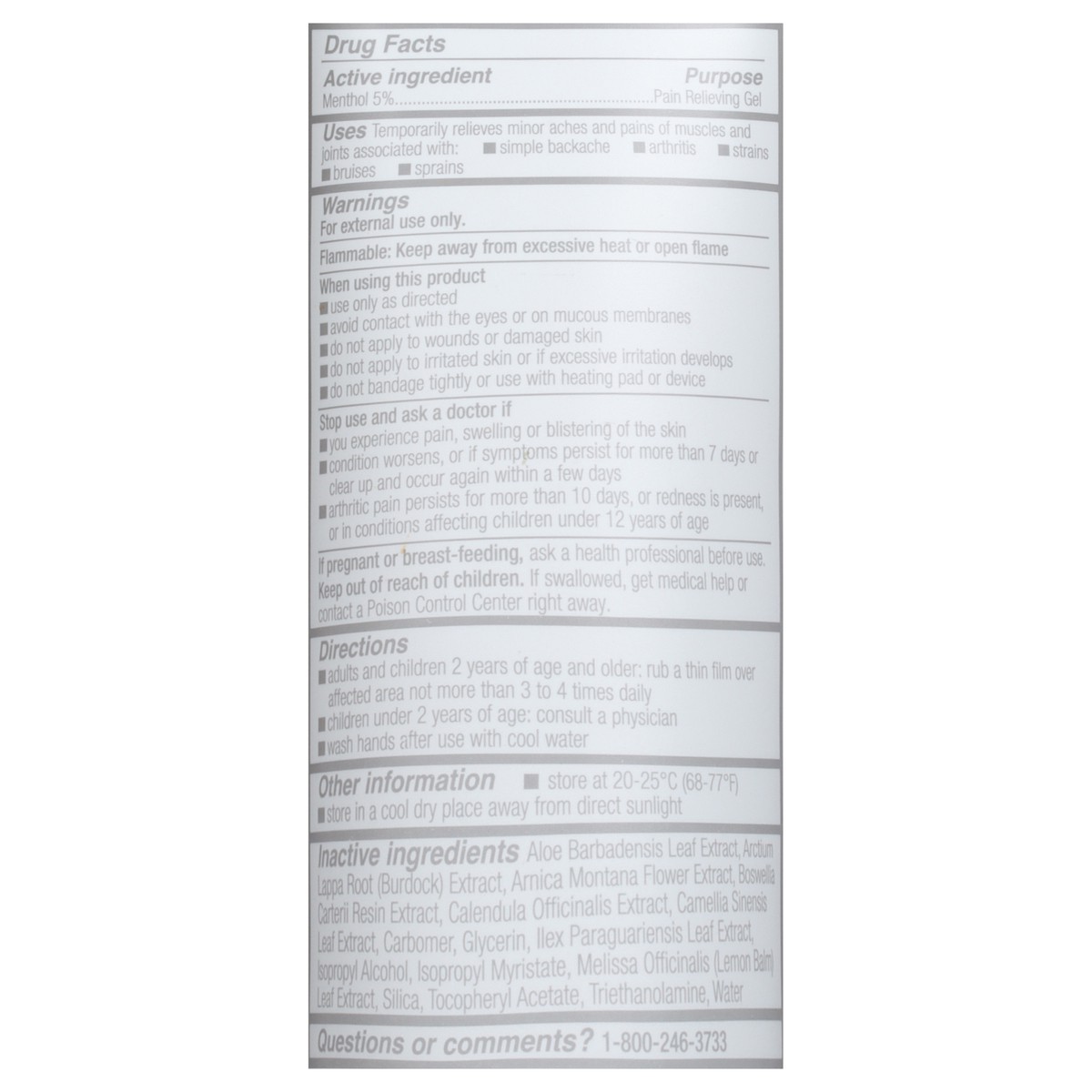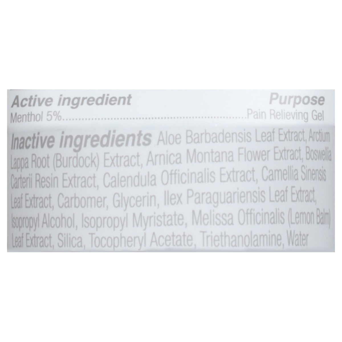 Active Ingredients: Menthol (5 %), Pain Relieving Gel. Inactive Ingredients: Aloe Barbadendsis Leaf Extract, Arctium Lappa Root (Burdock) Extract, Arnica Montana Flower Extract, Boswellia Carterii Res…