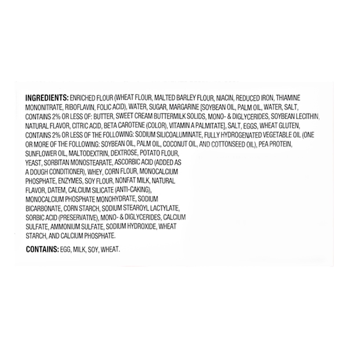 Enriched Flour (Wheat Flour, Malted Barley Flour, Niacin, Reduced Iron, Thiamine Mononitrate, Riboflavin, Folic Acid), Water, Sugar, Margarine (Soybean Oil, Palm Oil, Water, Salt, Contains 2% or Less …