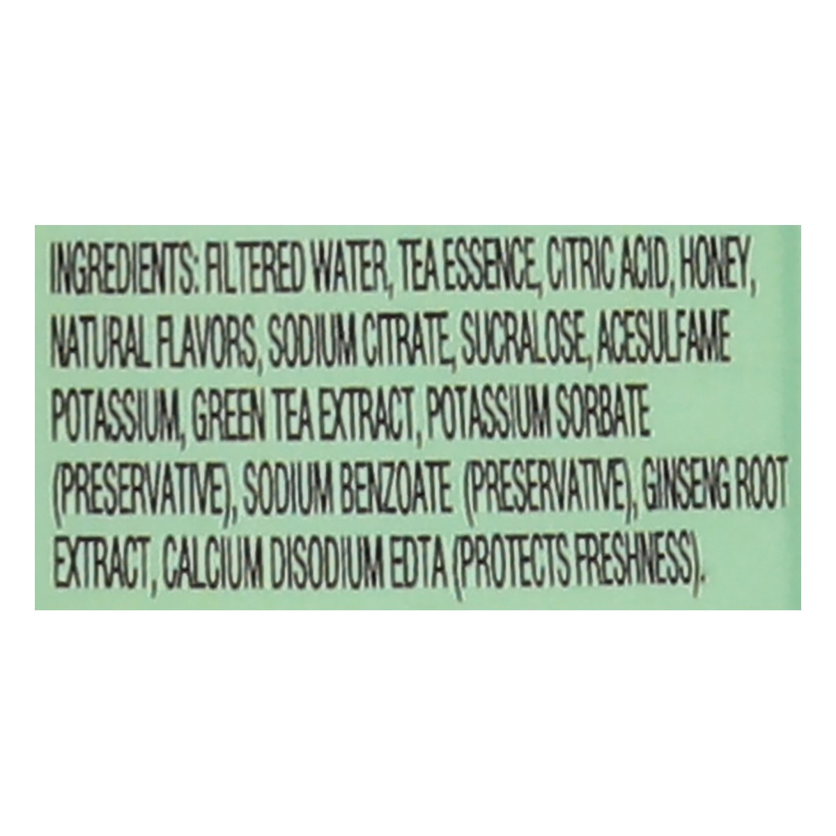 Filtered Water, Tea Essence, Citric Acid, Honey, Natural Flavors, Sodium Citrate, Sucralose, Acesulfame Potassium, Green Tea Extract, Potassium Sorbate (Preservative), Sodium Benzoate (Preservative), …