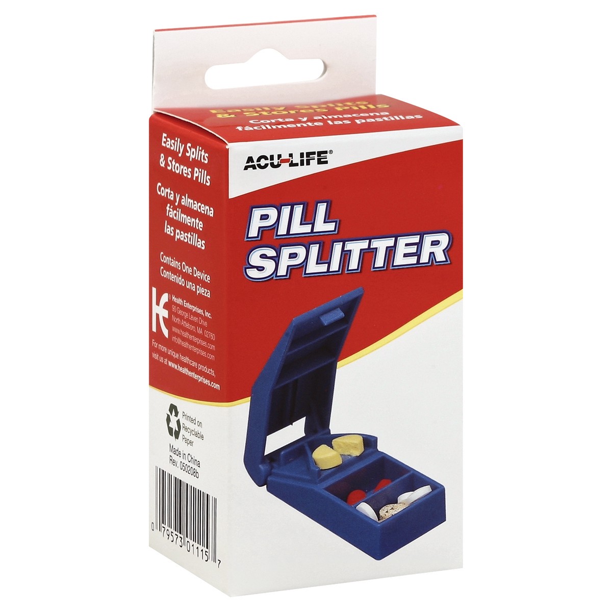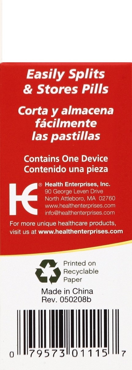Easily splits & stores pills. Contains one device. www.healthenterprises.com. info at healthenterprises.com. For more unique healthcare products, visit us at www.healthenterprises.com. Printed on recy…