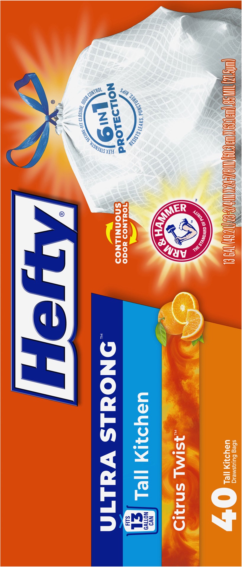 Trust Hefty Ultra Strong 13 Gallon Trash Bags to keep your kitchen waste contained—all the way from the can to the curb. Thanks to 6-in-1 Protection, these tall kitchen trash bags offer flexible stren…