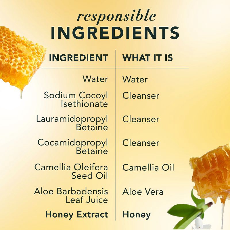 Health Facts: Dye-Free, Contains Honey, Contains Aloe, Paraben-Free, Contains Vitamin C, Contains Vitamin B, Silicone-Free, Sulfate-Free