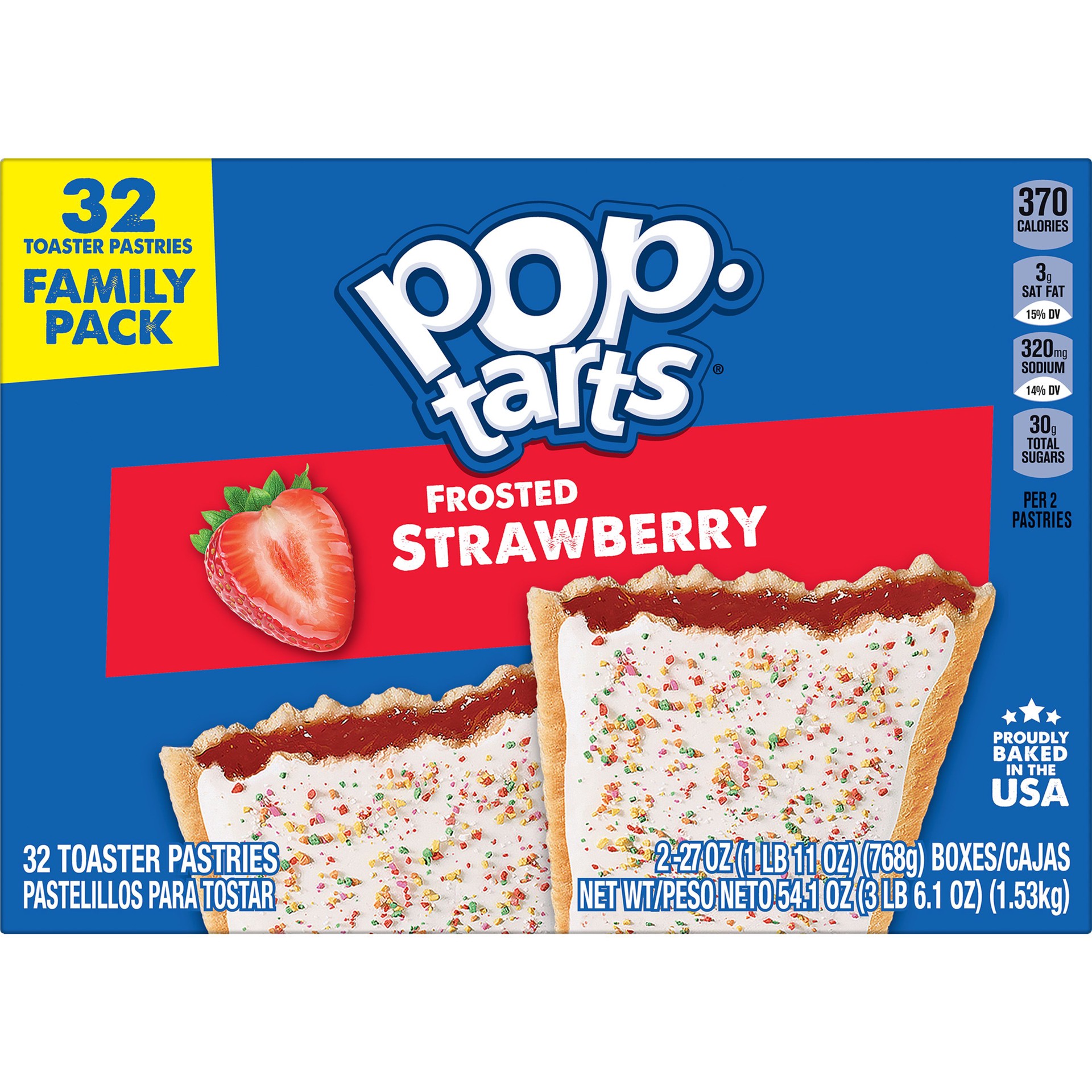 Pop-Tarts Frosted Strawberry toaster pastries are a delicious treat to look forward to any time of day. Includes one, 54.1-ounce box containing 64 Frosted Strawberry Pop-Tarts. Jump-start your day wit…