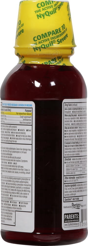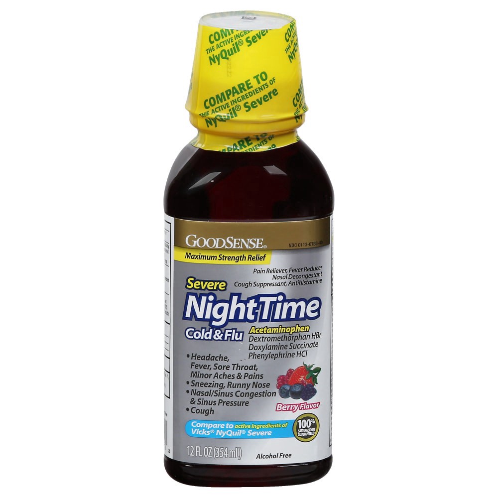 slide 1 of 4, Goodsense Severe Night Time Cold & Flu Medicine Acetaminophen Liquid, 12 oz