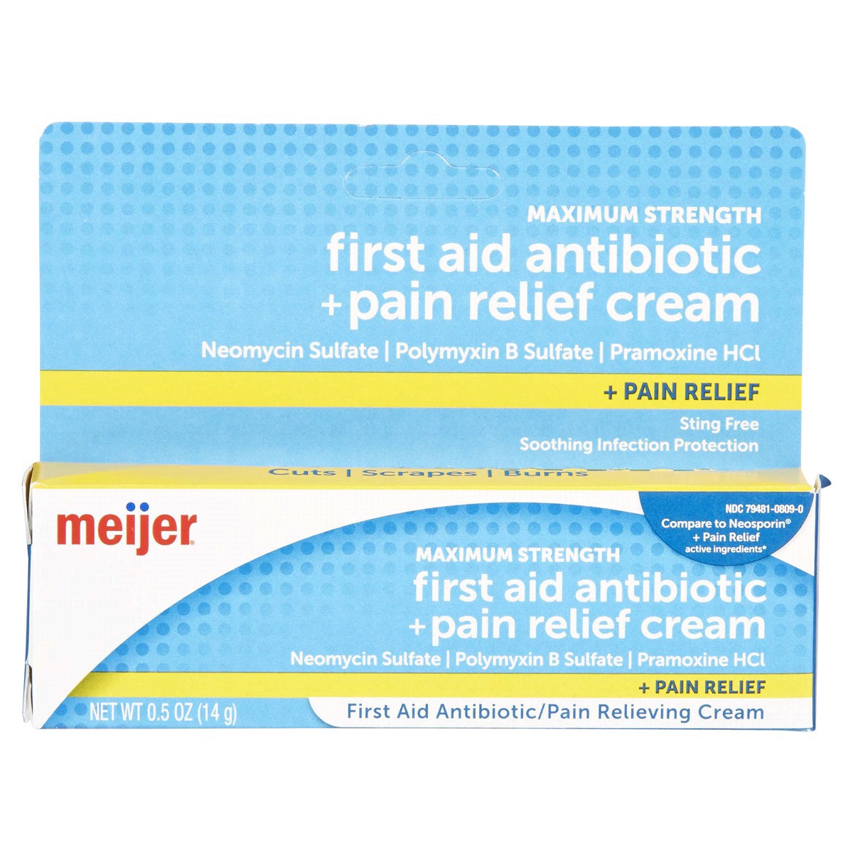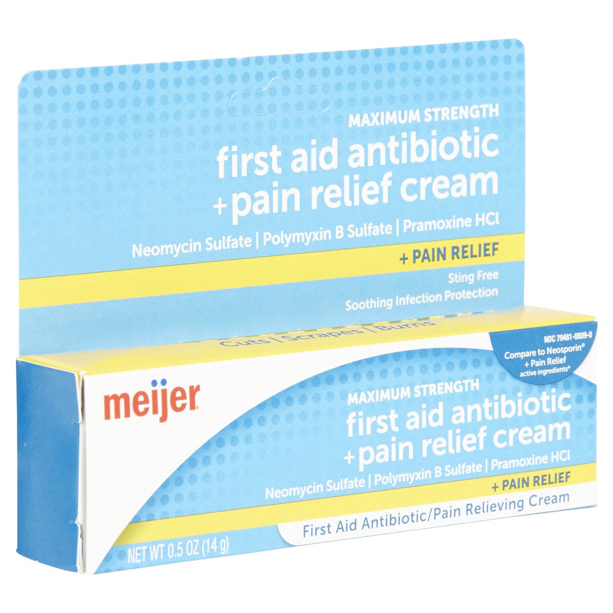 Compare to Neosporin Pain Relief active ingredients. Meijer Maximum Strength First Aid Antibiotic Pain Relieving Cream offers soothing infection protection for cuts, scrapes and burns. Helps skin hea…