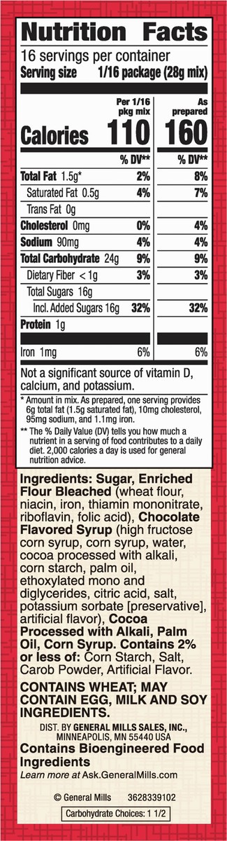 Per 1/16 Package: 110 calories; 0 g sat fat (2% DV); 90 mg sodium (4% DV); 16 g total sugars. Partially produced with genetic engineering. Learn more at Ask.GeneralMills.com. 1 pan. With a pouch of ch…