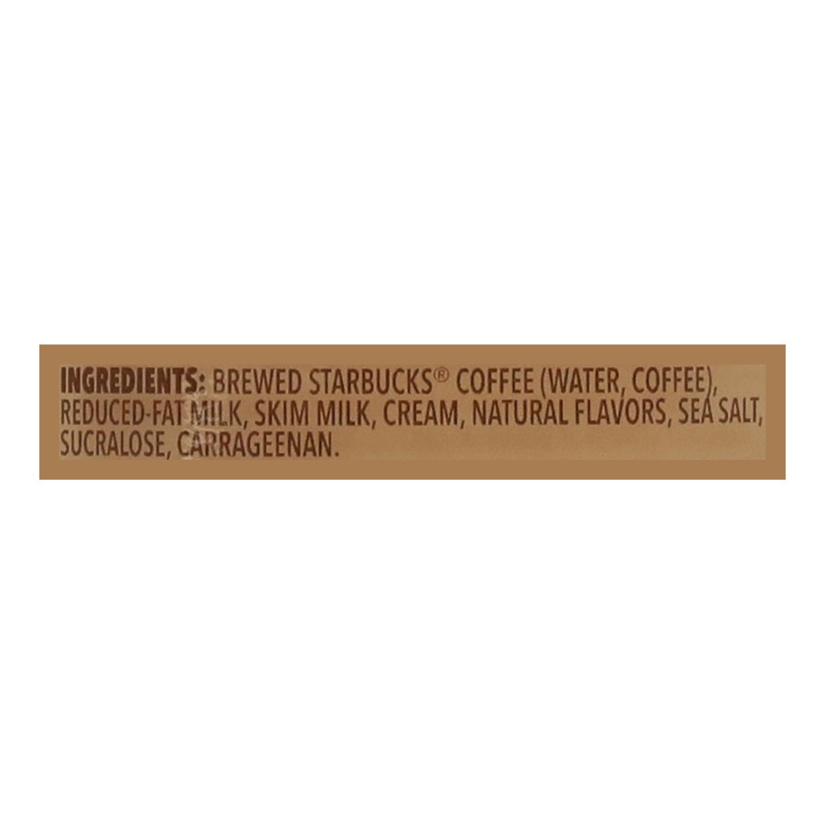 Brewed Starbucks Coffee (Water, Coffee), Reduced-Fat Milk, Skim Milk, Cream, Natural Flavors, Sea Salt, Sucralose, Carrageenan.