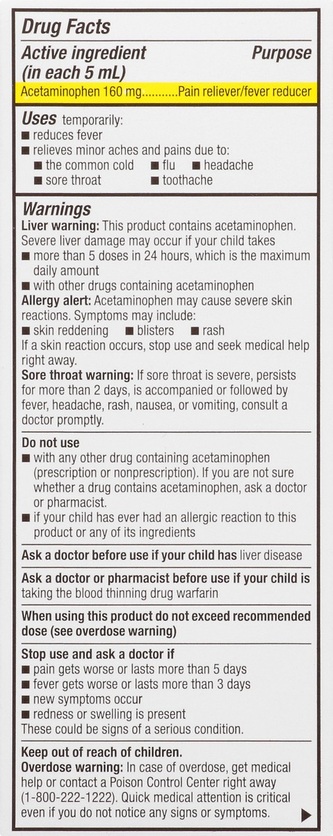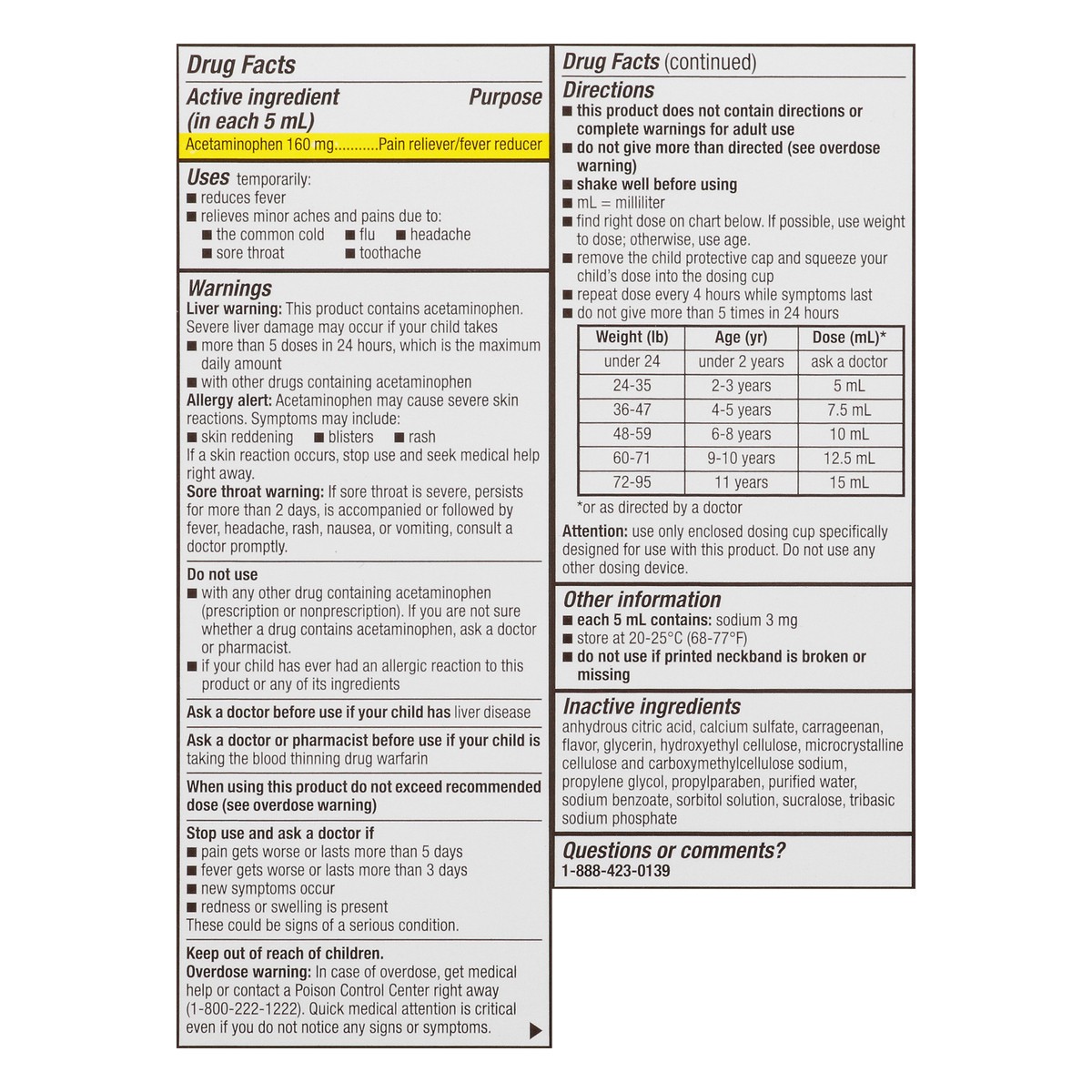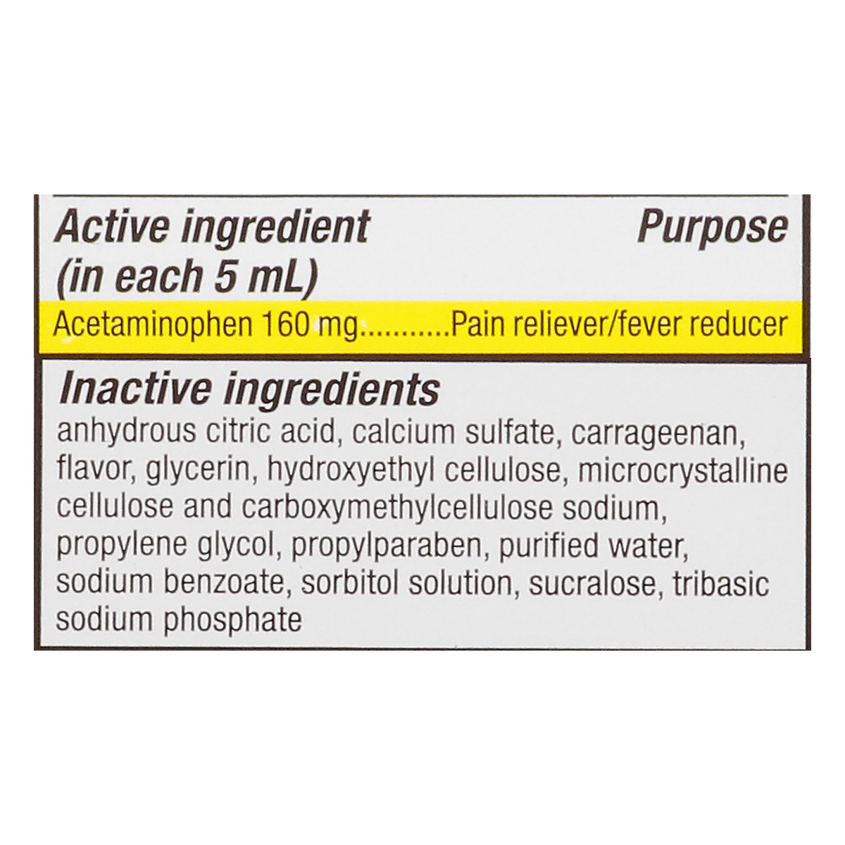 In Each 5 ml: Active Ingredients: Acetaminophen (160 mg), Pain Reliever/Fever Reducer. Inactive Ingredients: Anhydrous Citric Acid, Calcium Sulfate, Carrageenan, Flavor, Glycerin, Hydroxyethyl Cellulo…