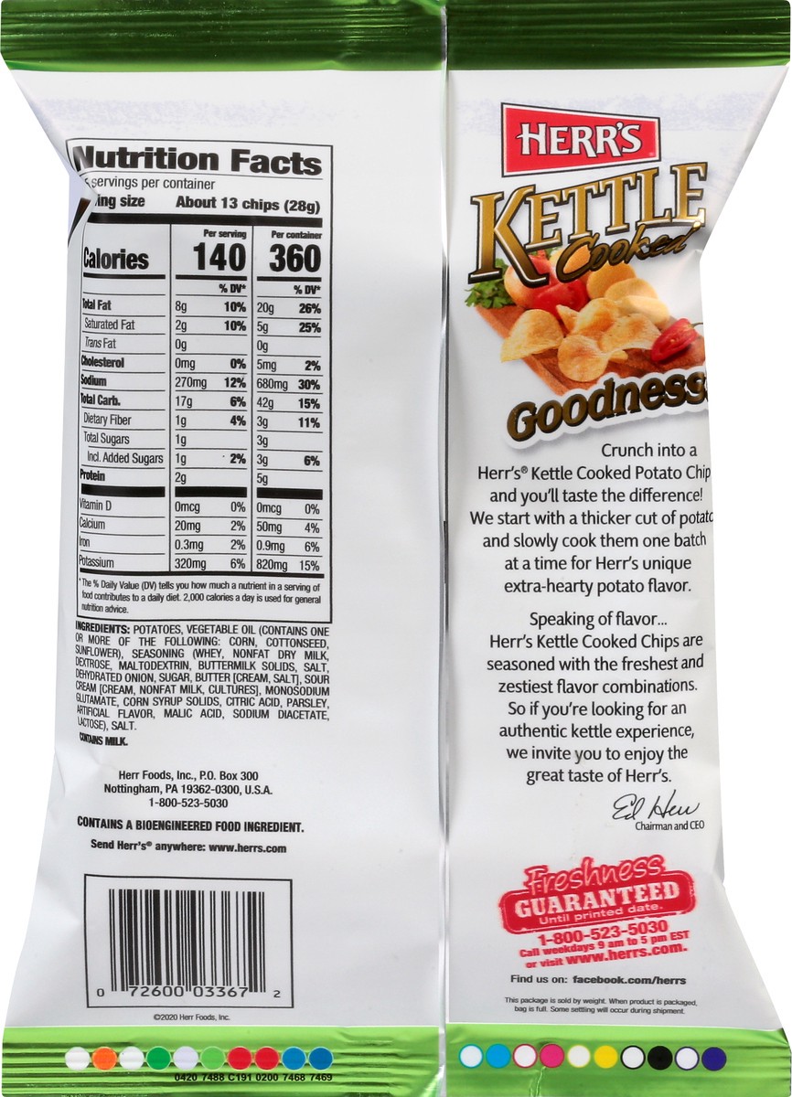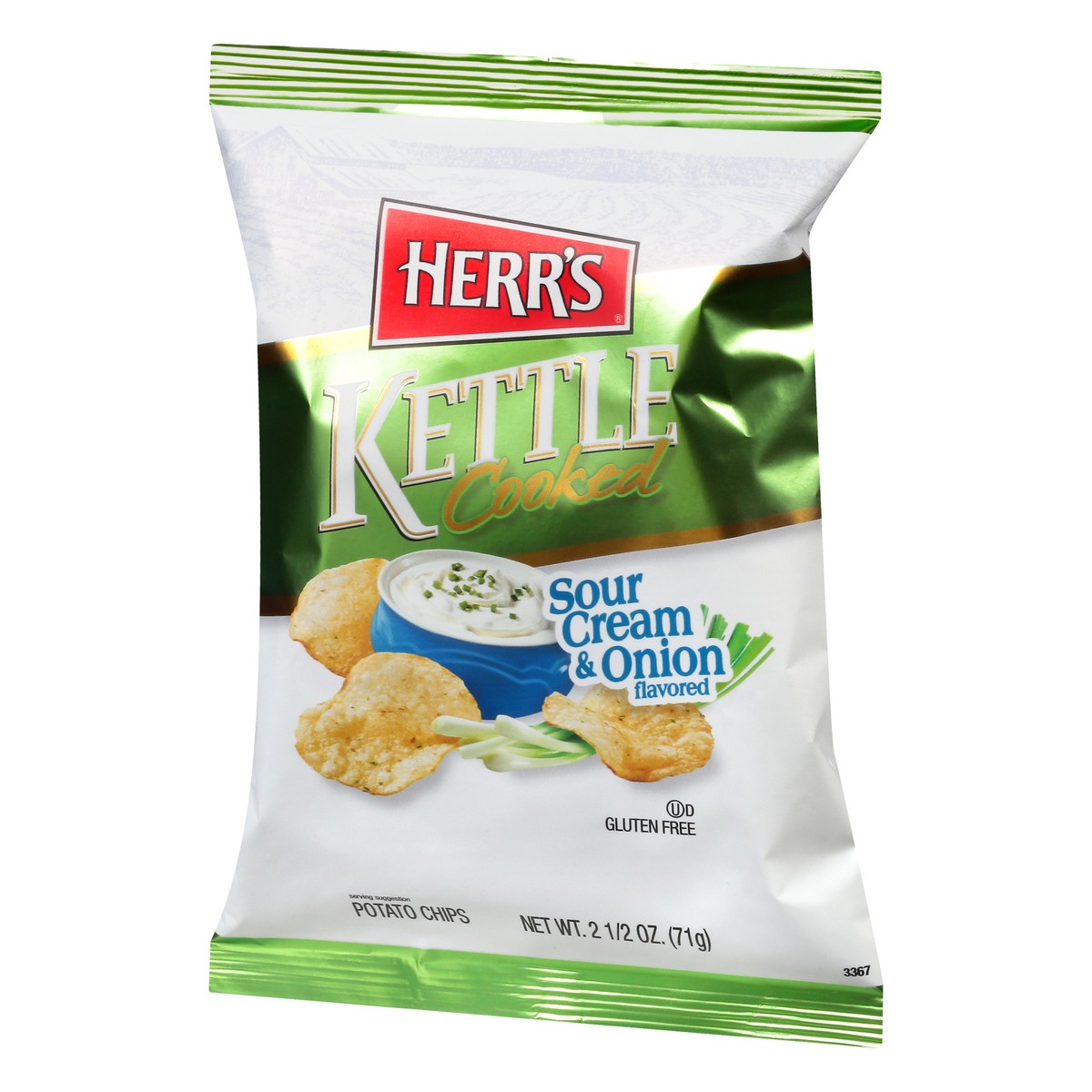 Gluten free. Contains a bioengineered food ingredient. Goodness! Crunch into a Herrs's kettle cooked potato chip and you'll taste the difference! We start with a thicker cut of potato and slowly cook …