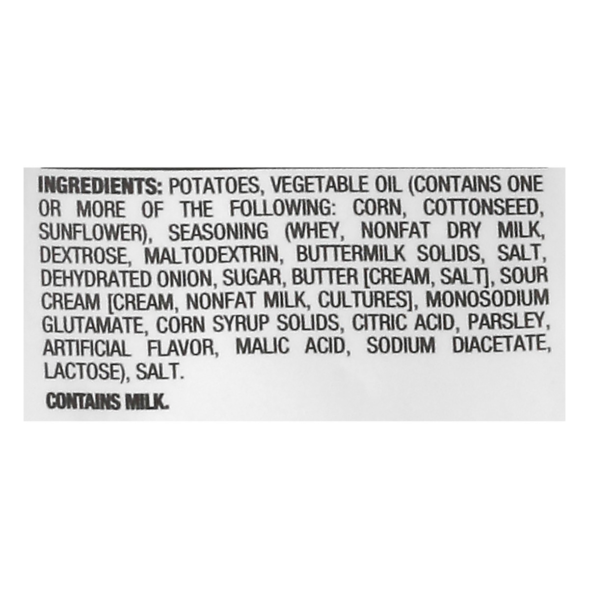 Potatoes, Vegetable Oil (Contains One or More of the Following: Corn, Cottonseed, Sunflower), Seasoning (Whey, Nonfat Dry Milk, Dextrose, Maltodextrin, Buttermilk Solids, Sat, Dehydrated Onion, Sugar,…