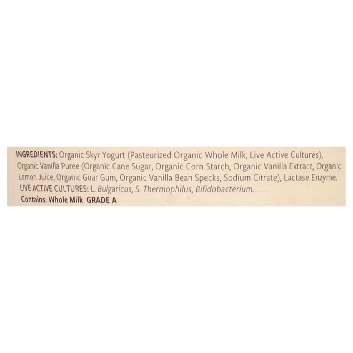 Organic Skyr Yogurt (Pasteurized Organic Whole Milk, Live Active Cultures), Organic Vanilla Puree (Organic Cane Sugar, Organic Corn Starch, Organic Vanilla Extract, Organic Lemon Juice, Organic Guar G…