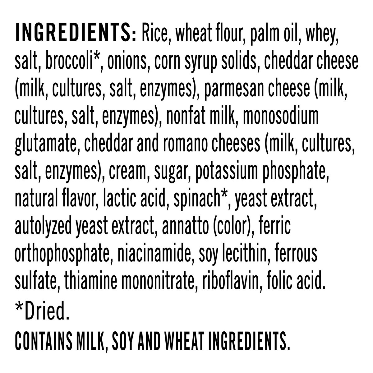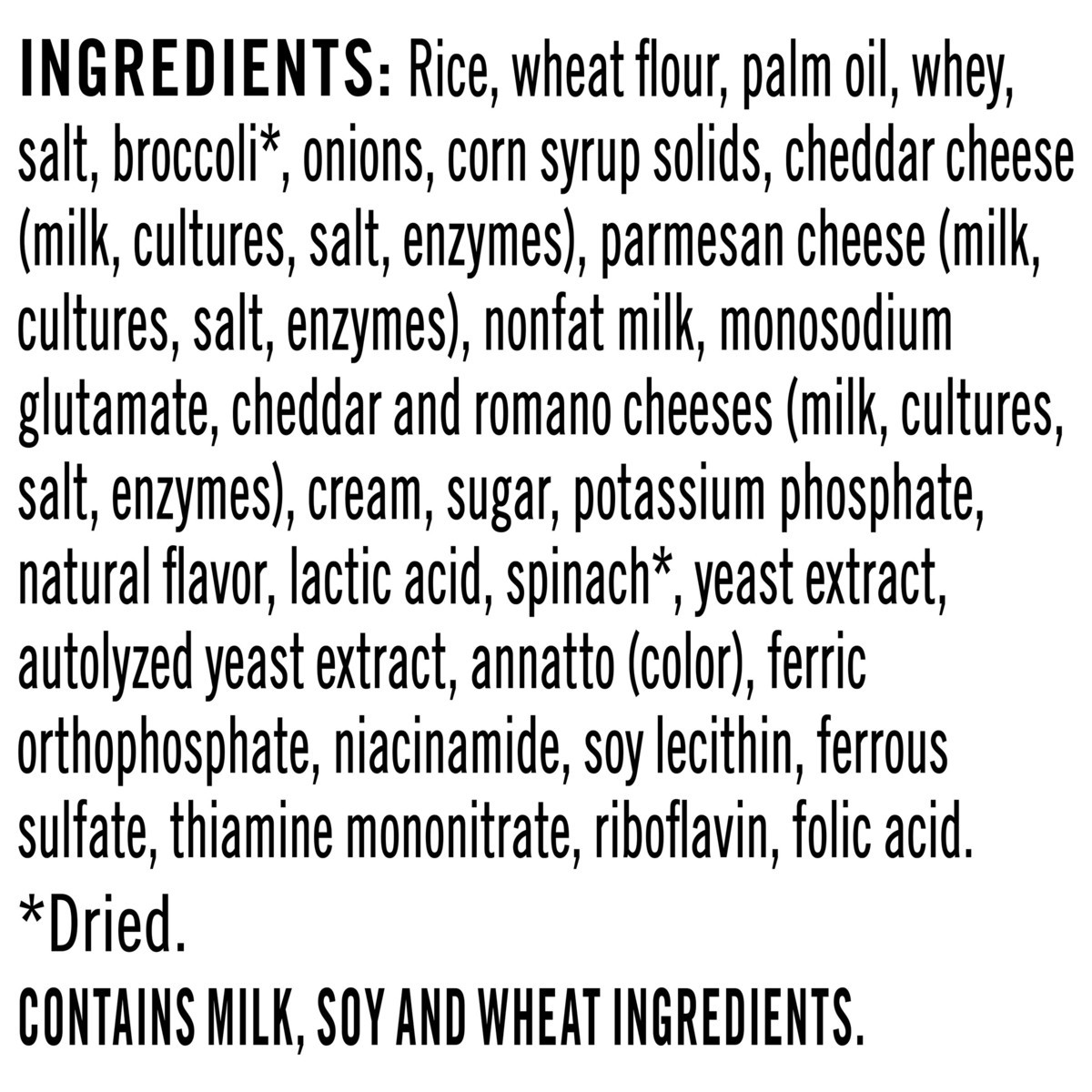 Rice, Wheat Flour, Palm Oil, Whey, Salt, Broccoli*, Onions, Corn Syrup Solids, Cheddar Cheese (Milk, Cultures, Salt, Enzymes), Parmesan Cheese (Milk, Cultures, Salt, Enzymes), Nonfat Milk, Monosodium …
