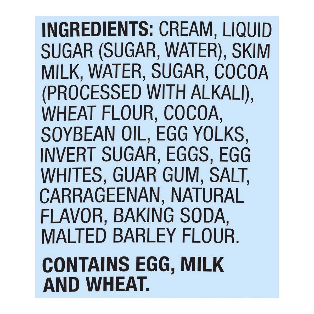 Cream, Liquid Sugar (Sugar, Water), Skim Milk, Water, Sugar, Cocoa (Processed with Alkali), Wheat Flour, Cocoa Powder, Soybean Oil, Egg Yolks, Invert Cane Sugar, Eggs, Egg Whites, Guar Gum, Salt, Carr…
