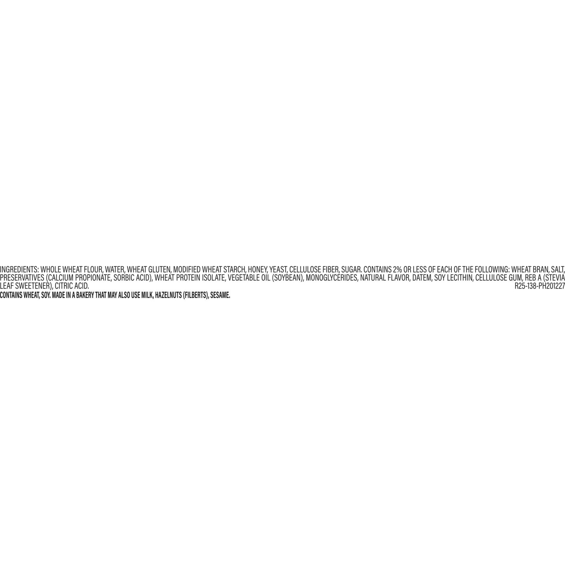Whole Wheat Flour, Water, Wheat Gluten, Modified Wheat Starch, Honey, Yeast, Cellulose Fiber, Sugar, Contains 2% Or Less Of Each Of The Following: [Wheat Bran, Salt, Preservatives [Calcium Propionate,…