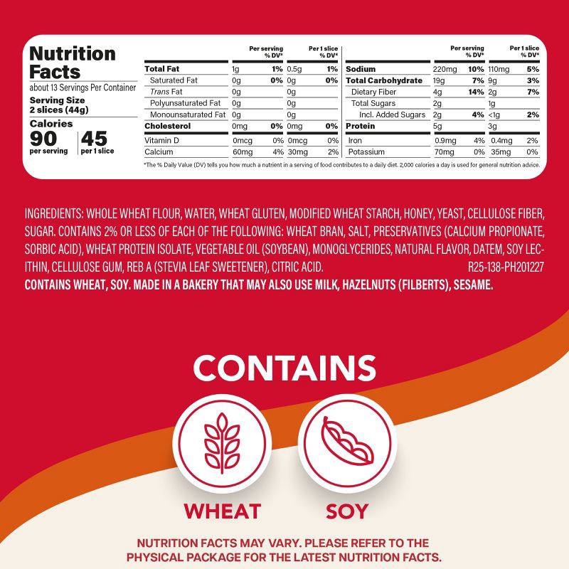 Whole Wheat Flour, Water, Wheat Gluten, Modified Wheat Starch, Honey, Yeast, Cellulose Fiber, Sugar, Contains 2% or Less of Each of the Following, Wheat Bran, Salt, Preservatives (Calcium Propionate, …