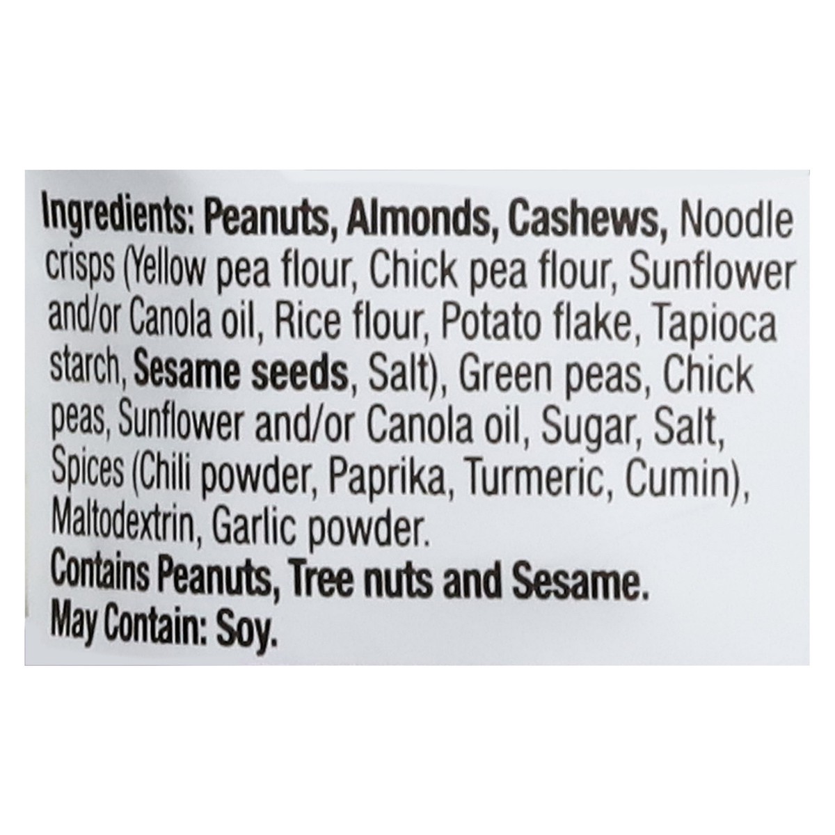 Peanuts, Almonds, Cashews, Noodle Crisps (Yellow Pea Flour, Chick Pea Flour, Sunflower and/or Canola Oil, Rice Flour, Potato Flake, Tapioca Starch, Sesame Seeds, Salt), Green Peas, Chick Peas, Sunflow…