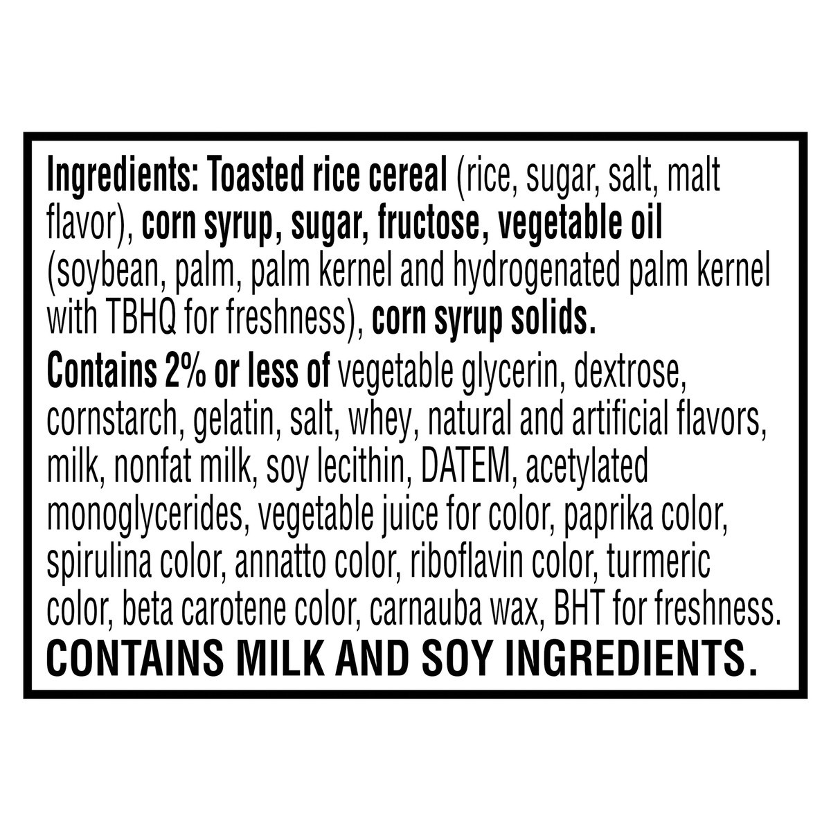 Toasted Rice Cereal (Rice, Sugar, Salt, Malt Flavor), Corn Syrup, Sugar, Fructose, Vegetable Oil (Soybean, Palm, Palm Kernel and Hydrogenated Palm Kernel with TBHQ for Freshness), Corn Syrup Solids. C…