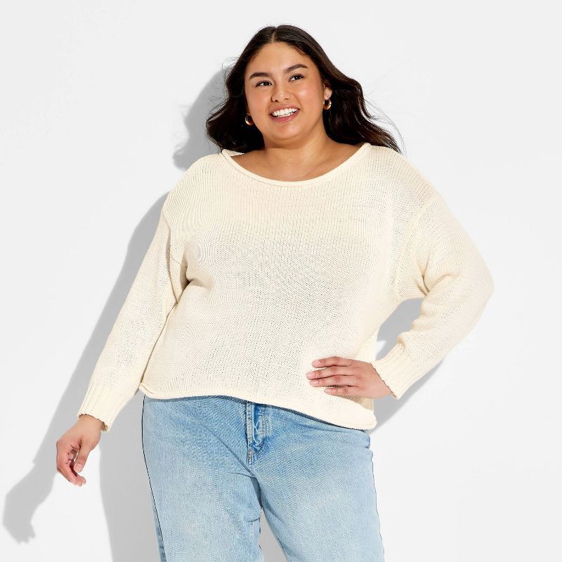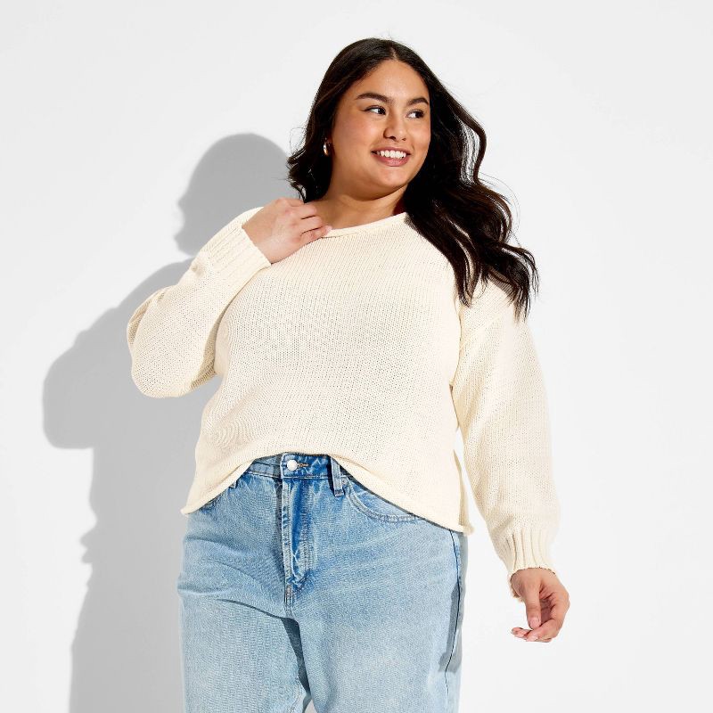 Chunky pullover sweater from Wild Fable™ with an off-the-shoulder neckline. Features drop-shoulder long sleeves with ribbed cuffs and rolled-edge detailing on the neck and waist. Crafted from heavywei…