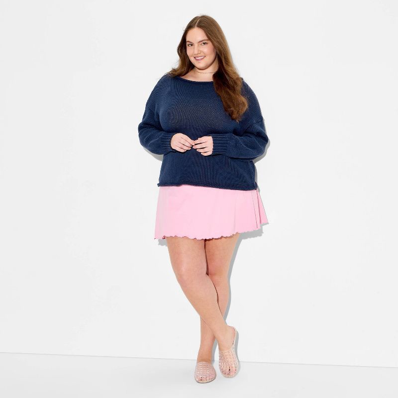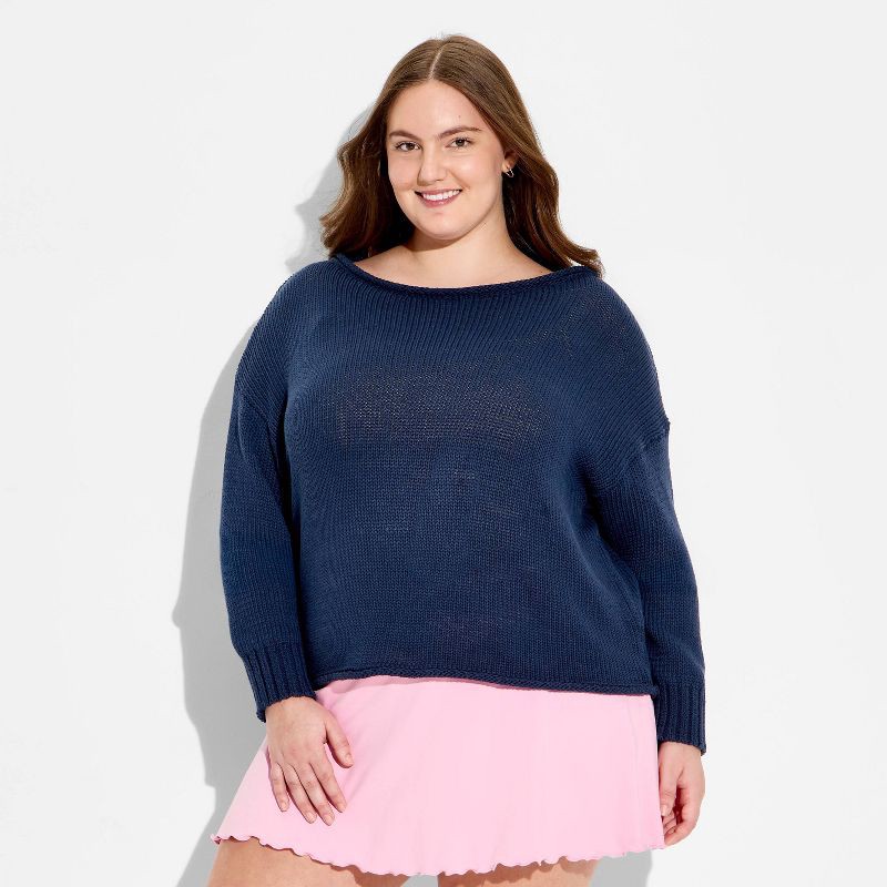 Chunky pullover sweater from Wild Fable™ with an off-the-shoulder neckline. Features drop-shoulder long sleeves with ribbed cuffs and rolled-edge detailing on the neck and waist. Crafted from heavywei…