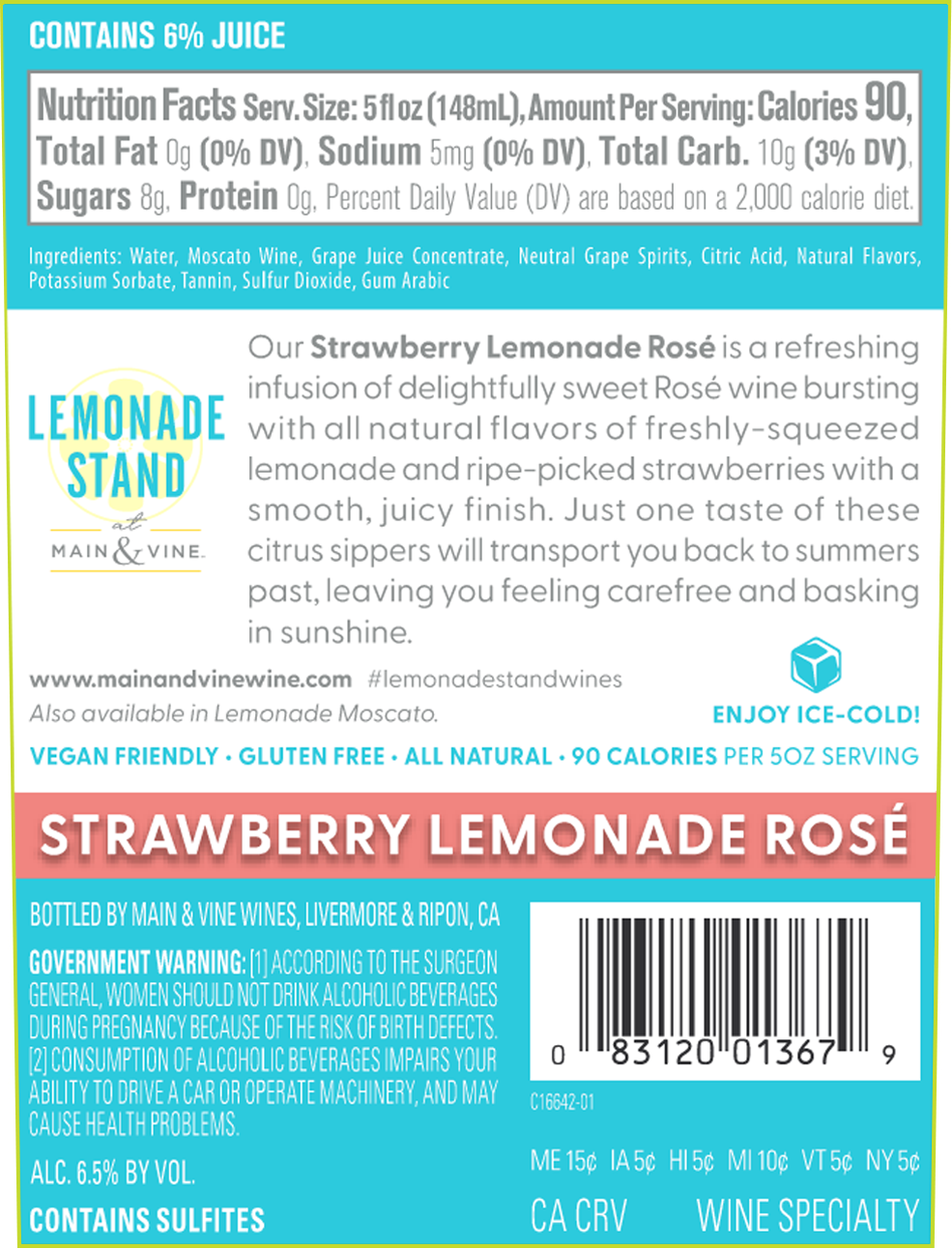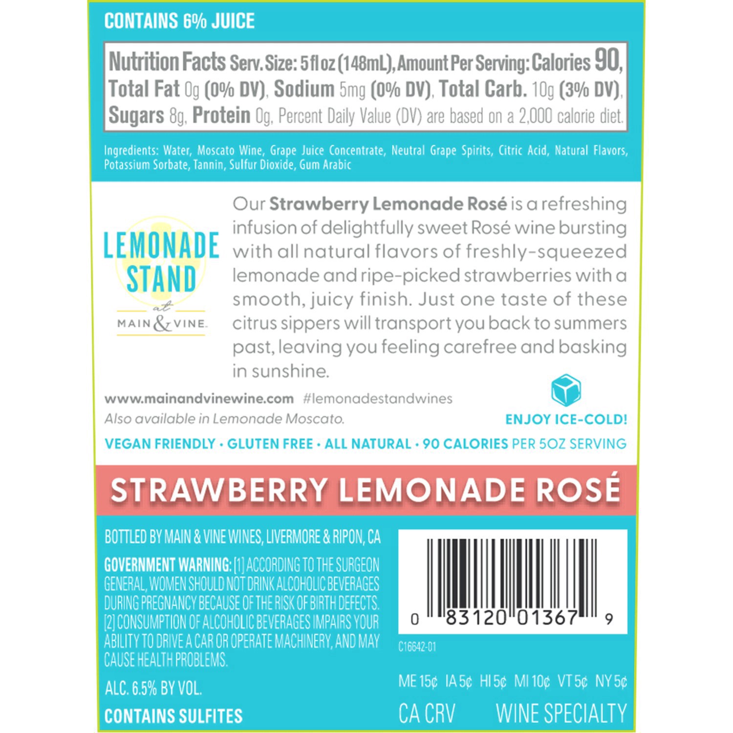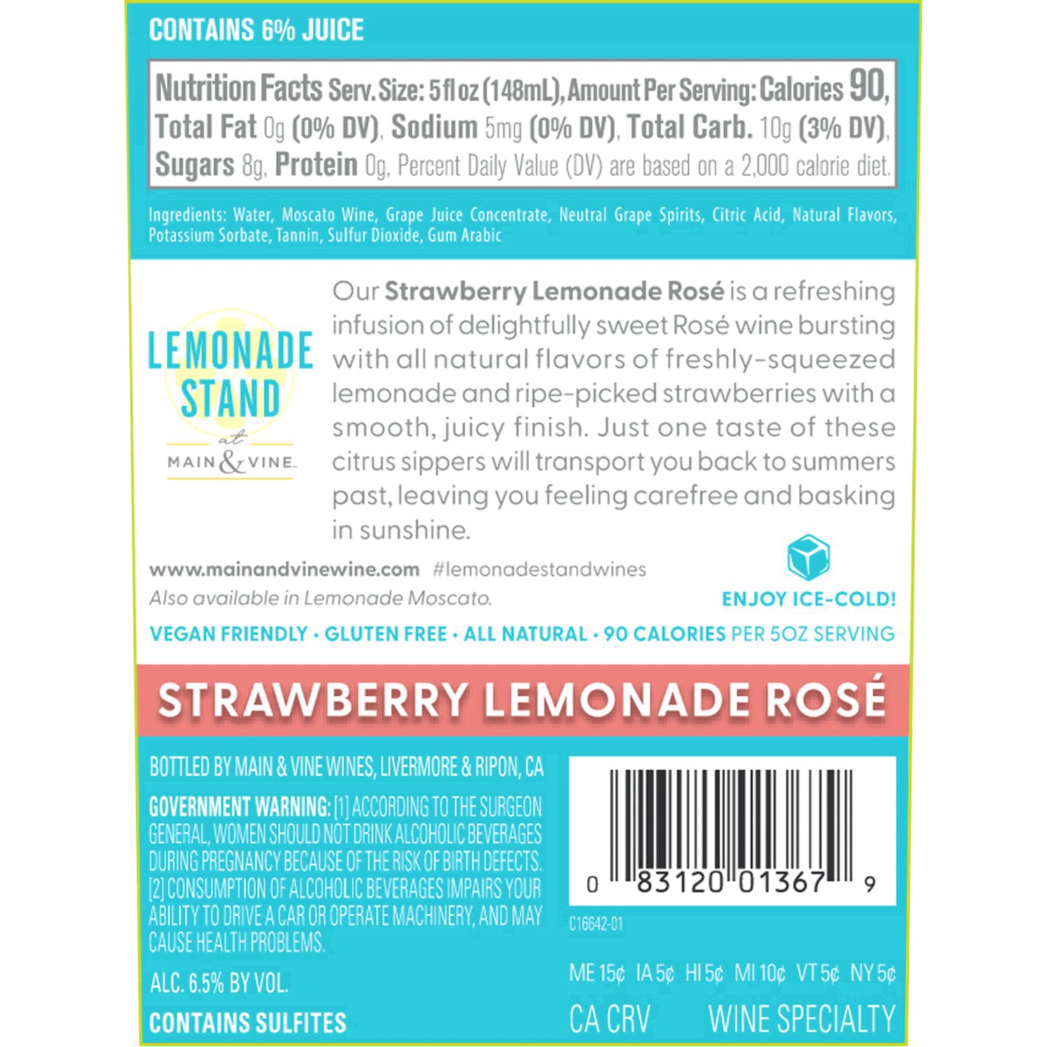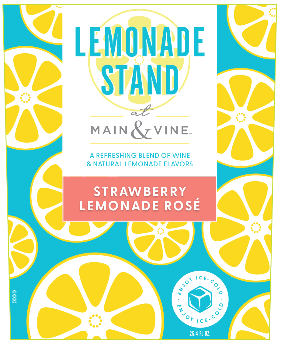 - One 750ml bottle of Lemonade Stand at Main & Vine™ Rose Pink WineLemonade Stand at Main & Vine Rose Lemonade Stand Strawberry Lemonade Rosé/Rose pink wine is a sweet Rosé/Rose bursting with flavors of freshly-squeezed lemonade, a refreshing blend of wine & natural lemonade flavors.Smooth body and finish profilePairs well with green salad, charcuterie, strawberry shortcake6.5% alcohol by volume (ABV)