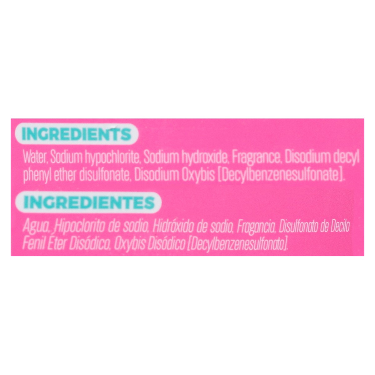 Water, Sodium Hypochlorite, Sodium Hydroxide, Fragrance, Disodium Decyl Phenyl Ether Disulfonate, Disodium Oxybis [Decylbenzenesulfonate].