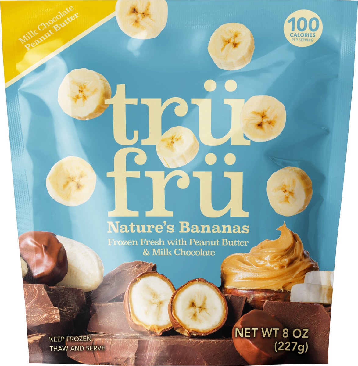 Tru Fru's fresh frozen fruit, indulgent snack contains bananas fully ripened and immersed in peanut butter and milk chocolate. Our real chocolate makes fruit better by complementing the fresh flavor o…