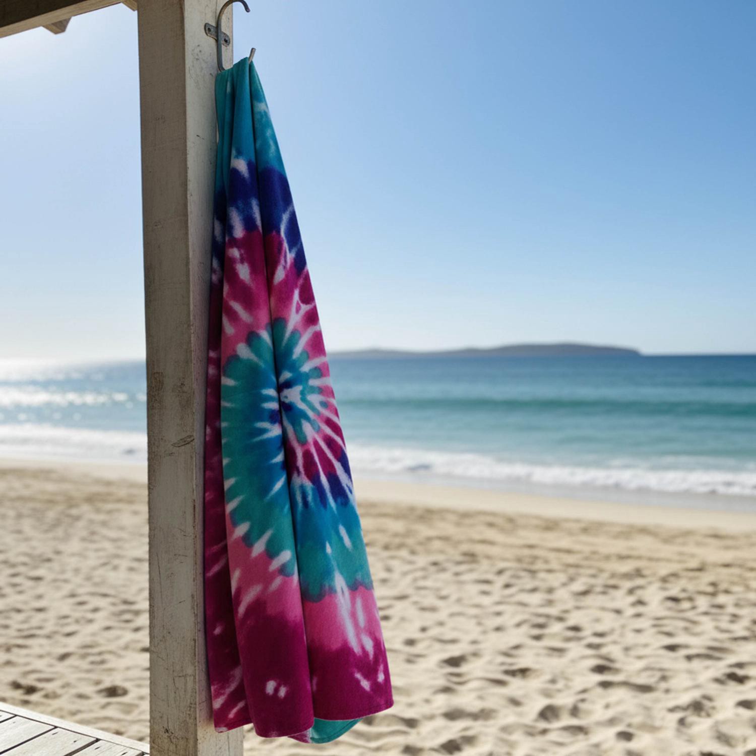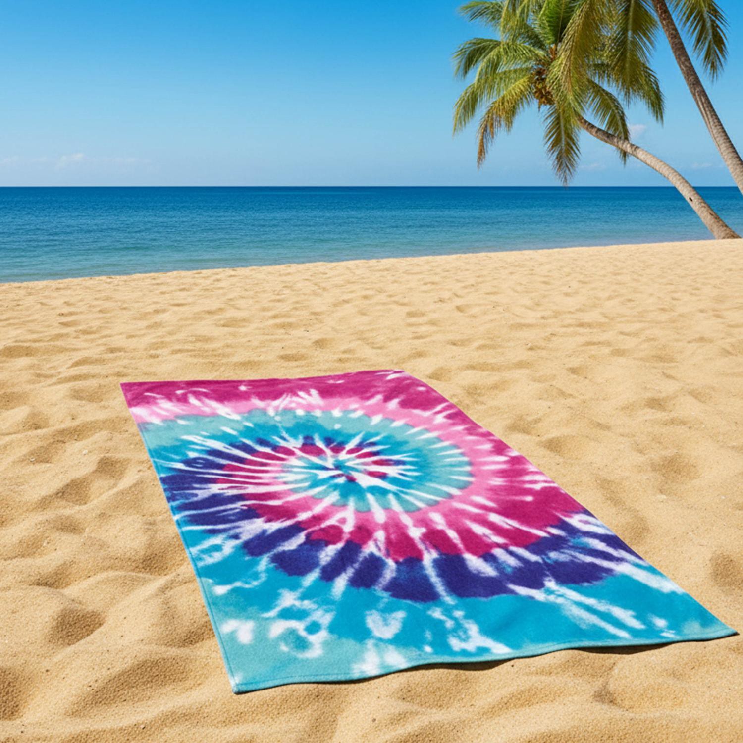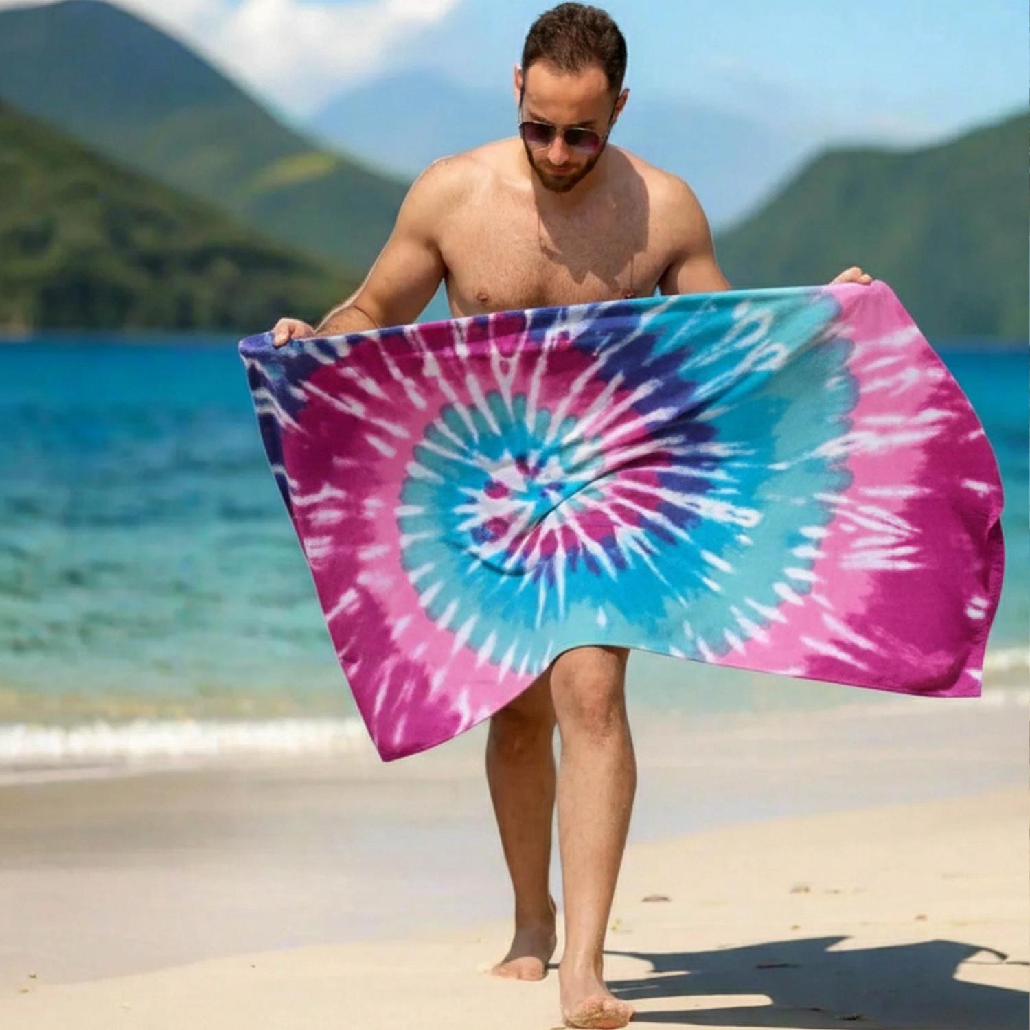 The soft and absorbent SOL BORNE Printed Pastel Tie Dye Beach Towel is the ideal companion for so many fun outdoor activities. This bright, multi-colored towel features a vibrant pattern of color incl…