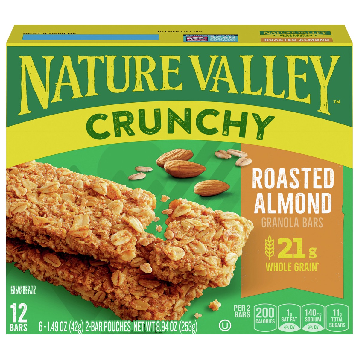 Nature Valley Crunchy Roasted Almond bars are a tasty snack made with real, roasted almonds and whole grain oats. There are no artificial flavors, colors or sweeteners and they pack an excellent sourc…