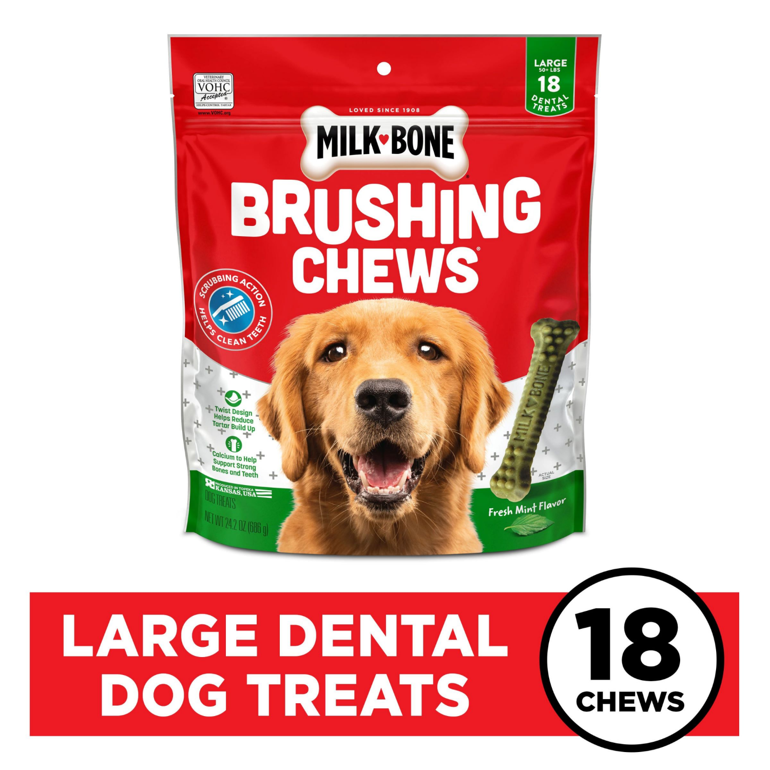 Milk-Bone Brushing Chews Daily Dental Dog Treats, Large, 24.2 Oz. Bag, 18 Bones Per Bag