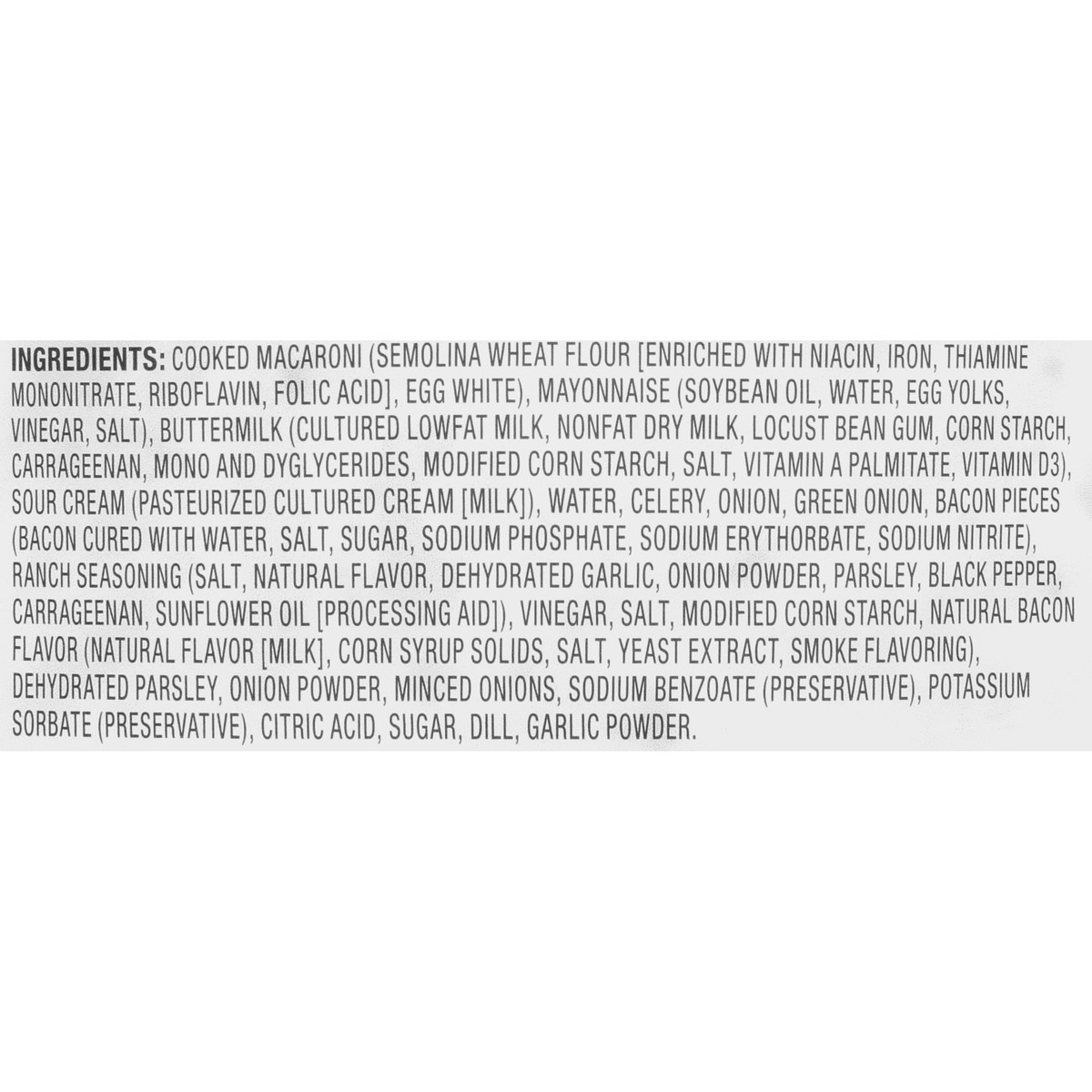 Cooked Macaroni (Semolina Wheat Flour [Enriched with Niacin, Iron, Thiamine Mononitrate, Riboflavin, Folic Acid], Egg White), Mayonnaise (Soybean Oil, Water, Egg Yolks, Vinegar, Salt), Buttermilk (Cul…