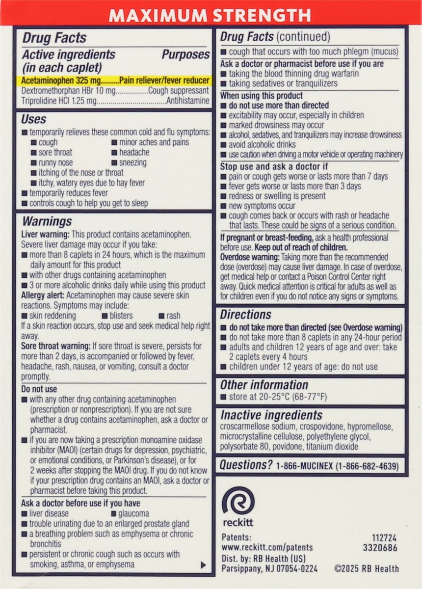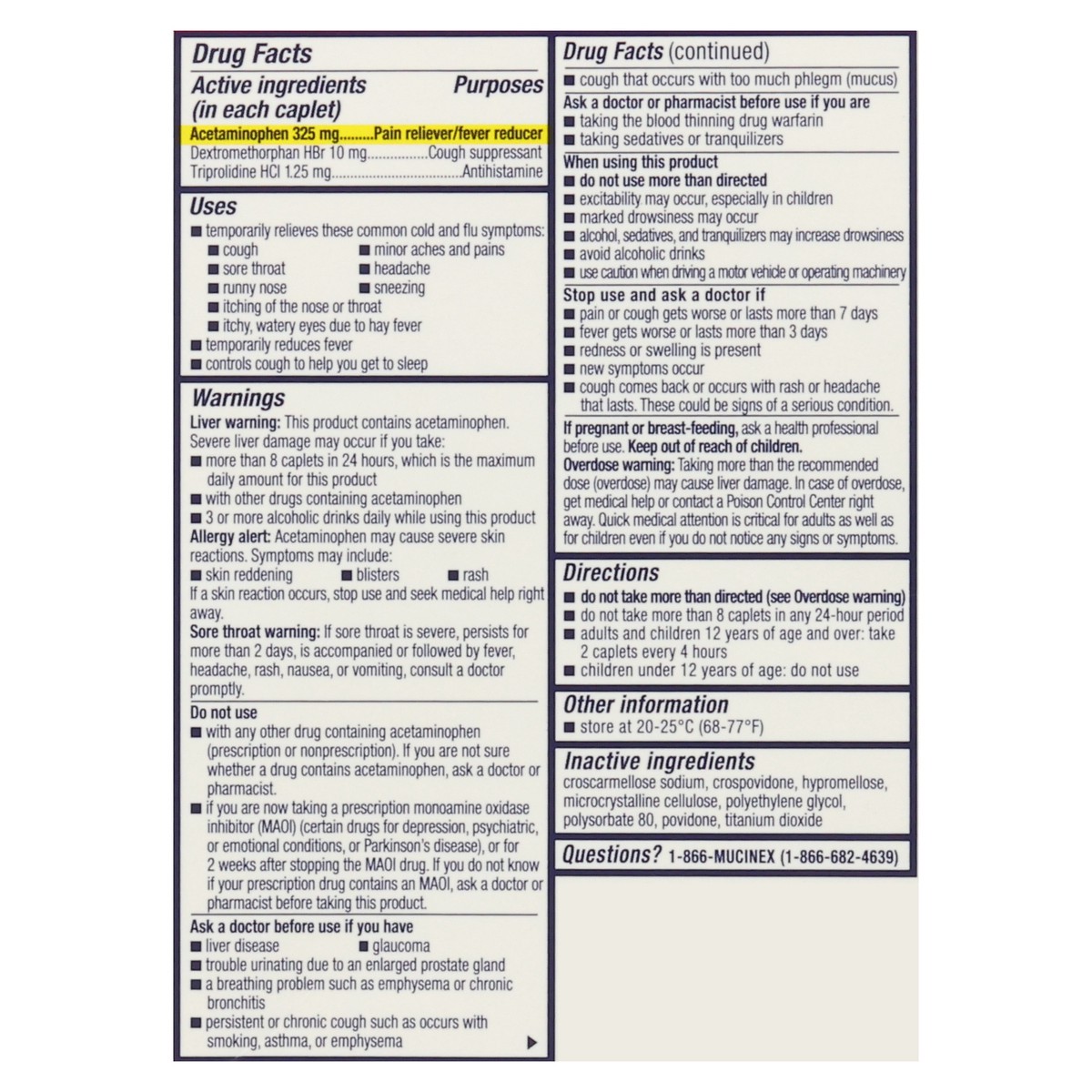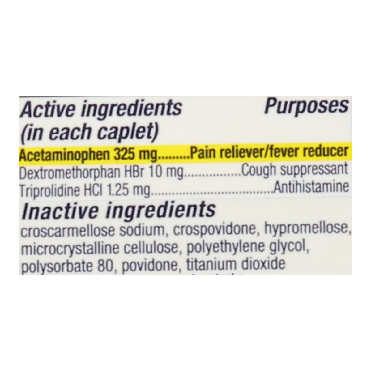 (in each caplet) Active Ingredients: Acetaminophen (325 mg), Pain Reliever/Fever Reducer; Dextromethorphan HBr (10 mg), Cough Suppressant; Triprolidine HCI (1.25 mg), Antihistamine. Inactive Ingredien…