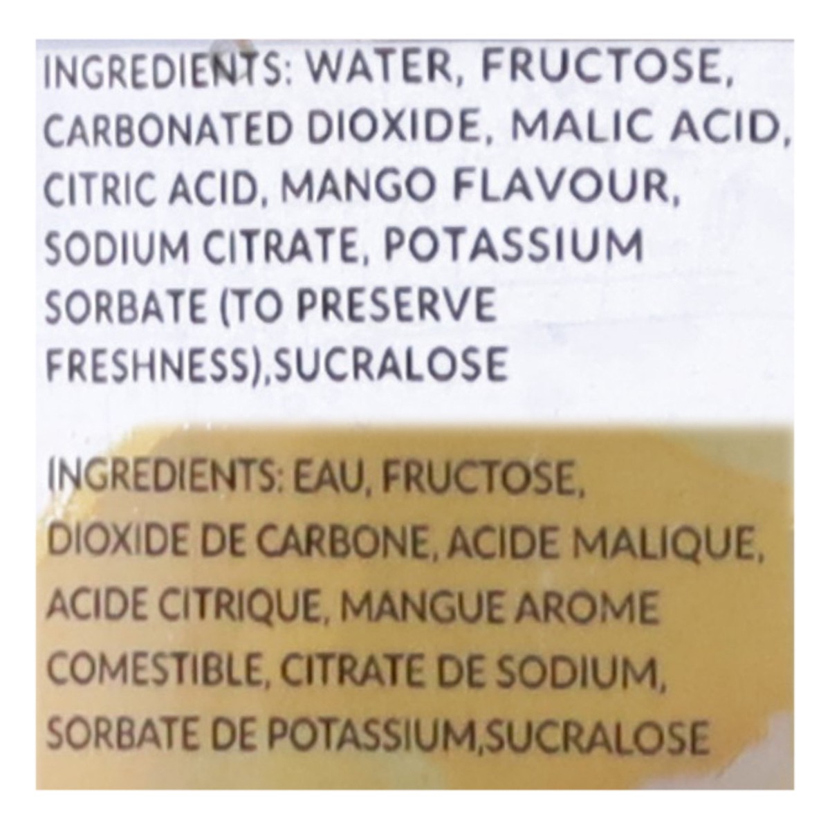 Water, Fructose, Carbonated Dioxide, Malic Acid, Citric Acid, Mango Flavour, Sodium Citrate, Potassium Sorbate (to Preserve Freshness), Sucralose.