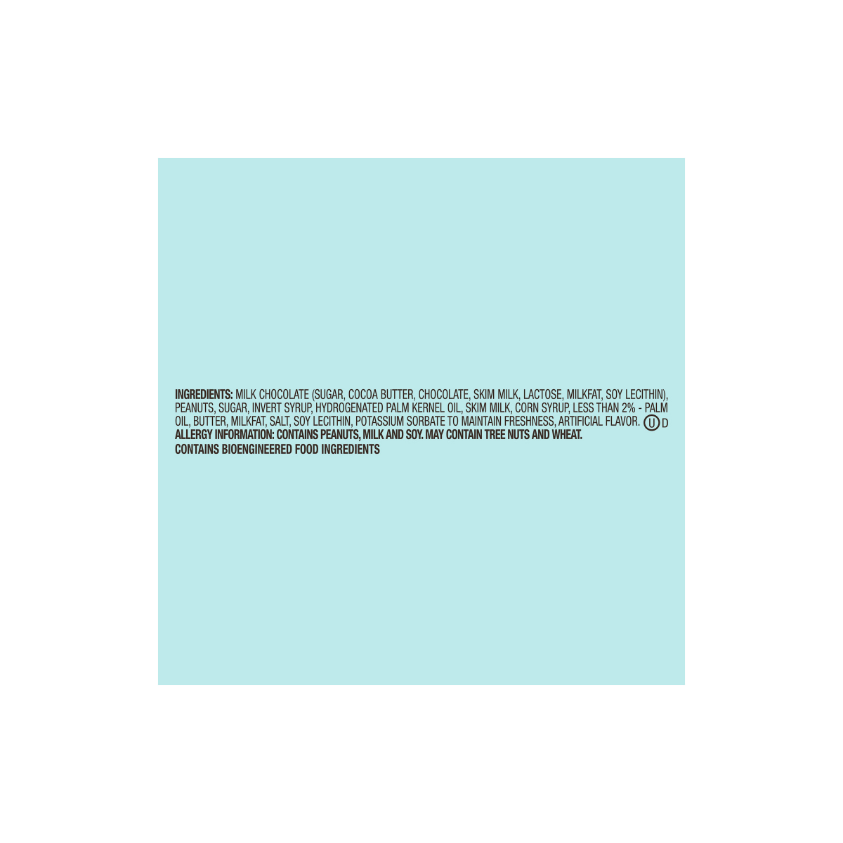 MILK CHOCOLATE (SUGAR, COCOA BUTTER, CHOCOLATE, SKIM MILK, LACTOSE, MILKFAT, SOY LECITHIN), PEANUTS, SUGAR, INVERT SUGAR, HYDROGENATED PALM KERNEL OIL, SKIM MILK, CORN SYRUP; LESS THAN 2% OF: PALM OIL…