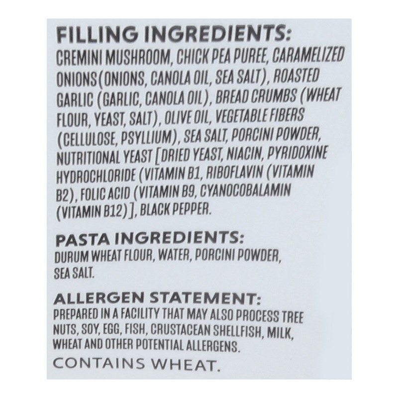 Filling Ingredients: Cremini Mushroom, Chick Pea Puree, Caramelized Onions (Onions, Canola Oil, Sea Salt), Roasted Garlic (Garlic, Canola Oil), Bread Crumbs (Wheat Flour, Yeast, Salt), Olive Oil, Vegeā¦