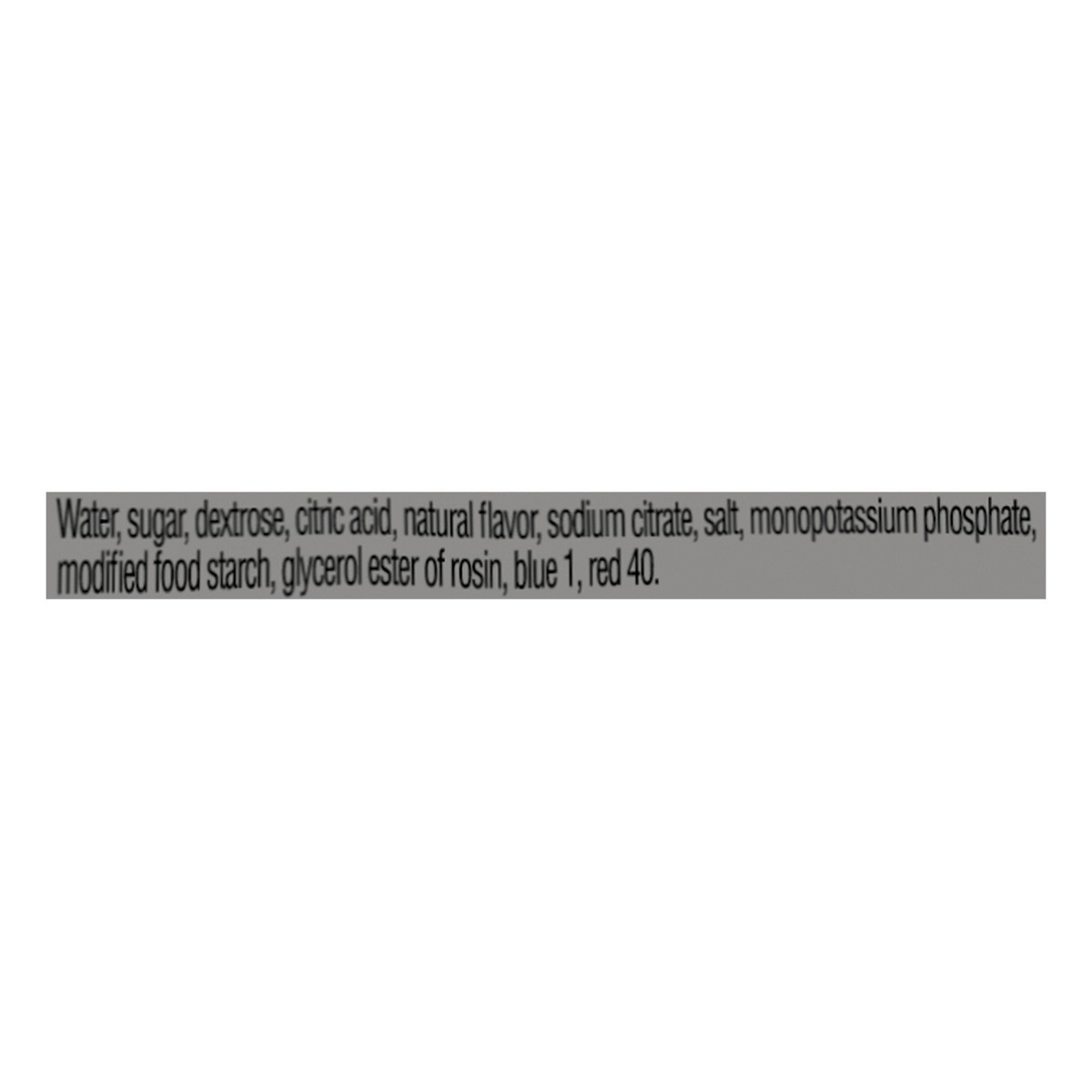 Water, Sugar, Dextrose, Citric Acid, Natural Flavor, Sodium Citrate, Salt, Monopotassium Phosphate, Modified Food Starch, Glycerol Ester of Rosin, Blue 1, Red 40.