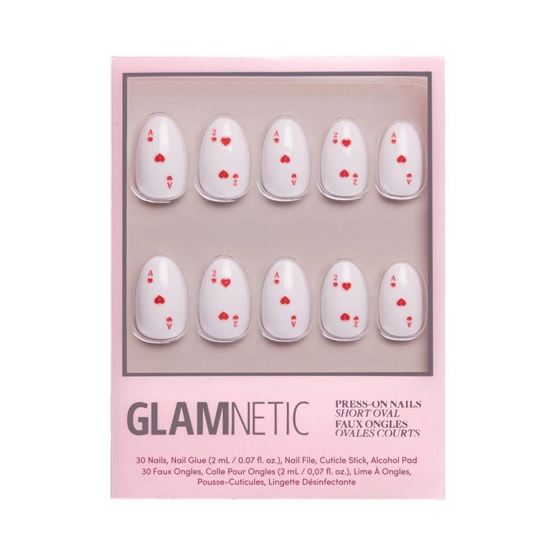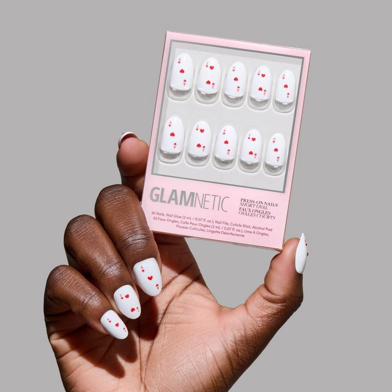 Glamnetic's Ace of Hearts nail set turns your mani into mini playing cards, without showing your hand. This crisp white, short oval set is adorned with raised red ace-of-hearts designs for a high-cont…