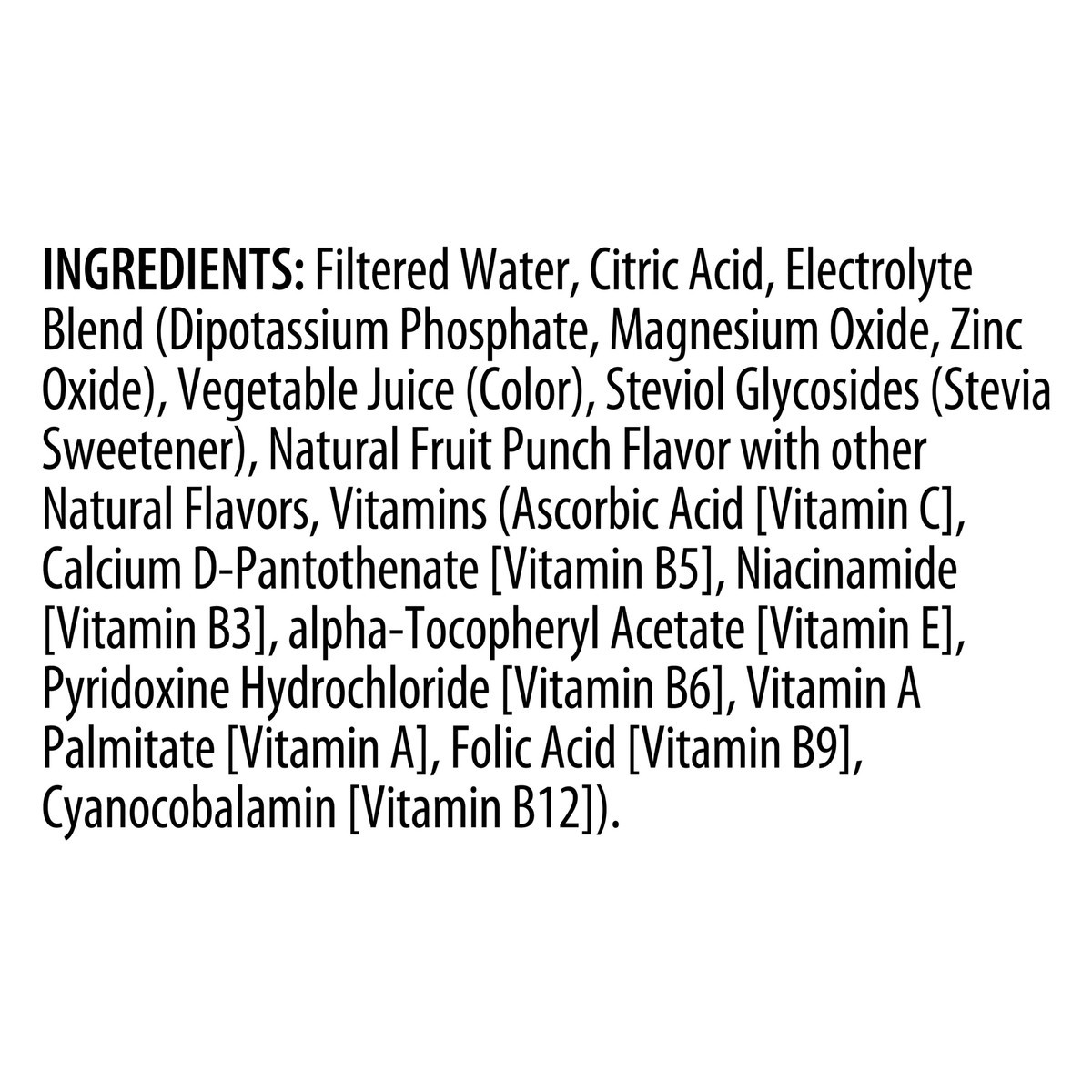 Filtered Water, Citric Acid, Electrolyte Blend (Dipotassium Phosphate, Magnesium Oxide, Zinc Oxide), Vegetable Juice (Color), Steviol Glycosides (Stevia Sweetener), Natural Fruit Punch Flavor with Oth…