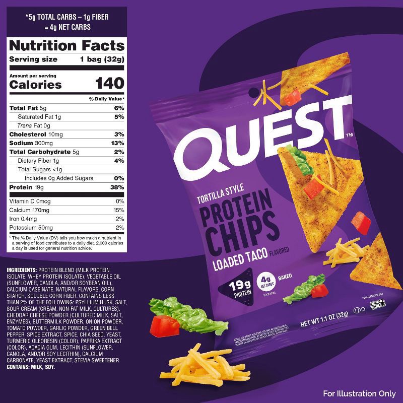 - ENJOY MORE. CARB LESS: The Quest Loaded Taco Tortilla Style Protein Chips provide all the crunch and satisfying taste of a regular tortilla chip. Only ours have 19g of protein and 4g net carbs per bag