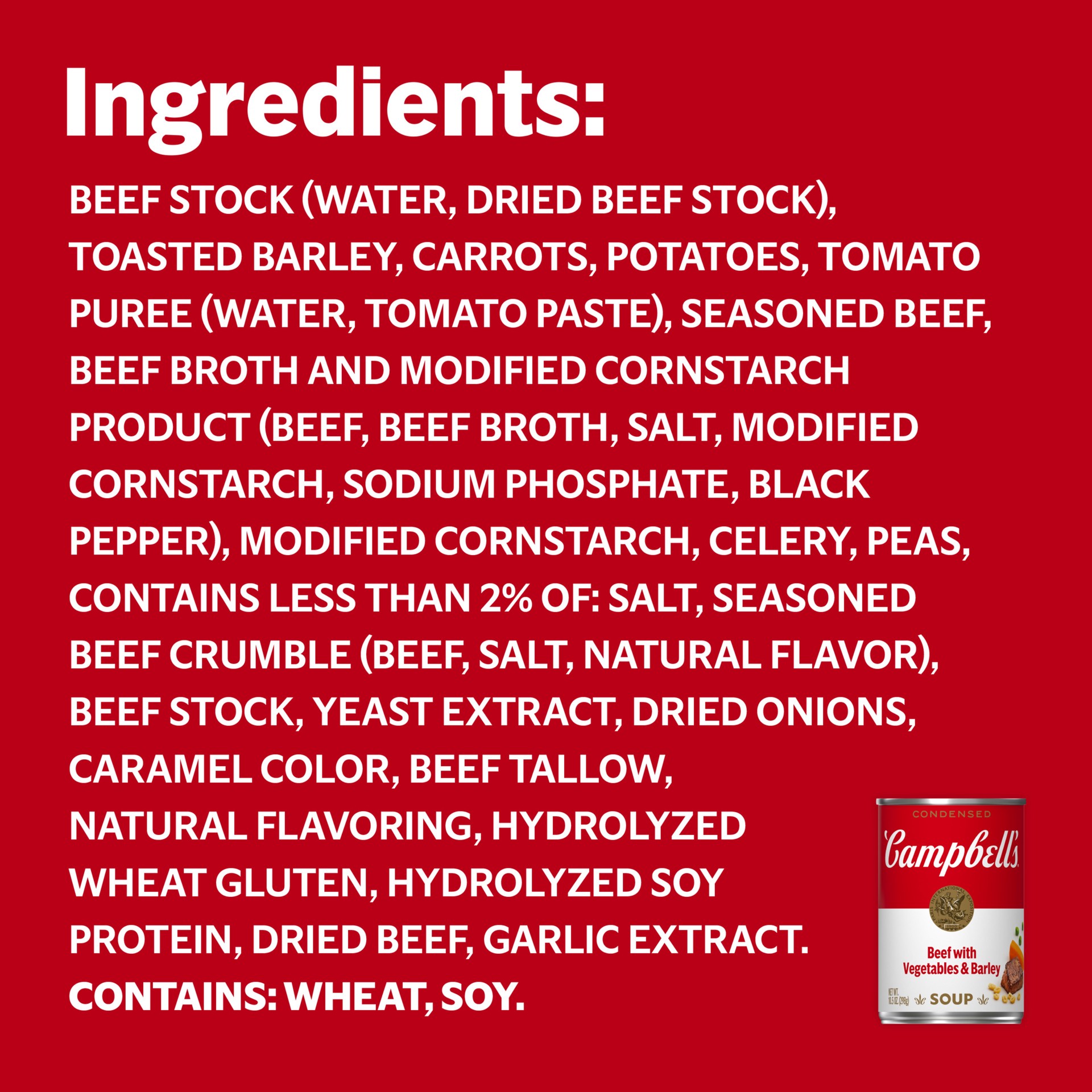 INGREDIENTS: BEEF STOCK (WATER, DRIED BEEF STOCK), TOASTED BARLEY, CARROTS, POTATOES, TOMATO PUREE (WATER, TOMATO PASTE), SEASONED BEEF, BEEF BROTH AND MODIFIED CORNSTARCH PRODUCT (BEEF, BEEF BROTH, S…