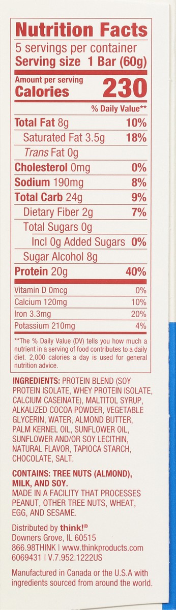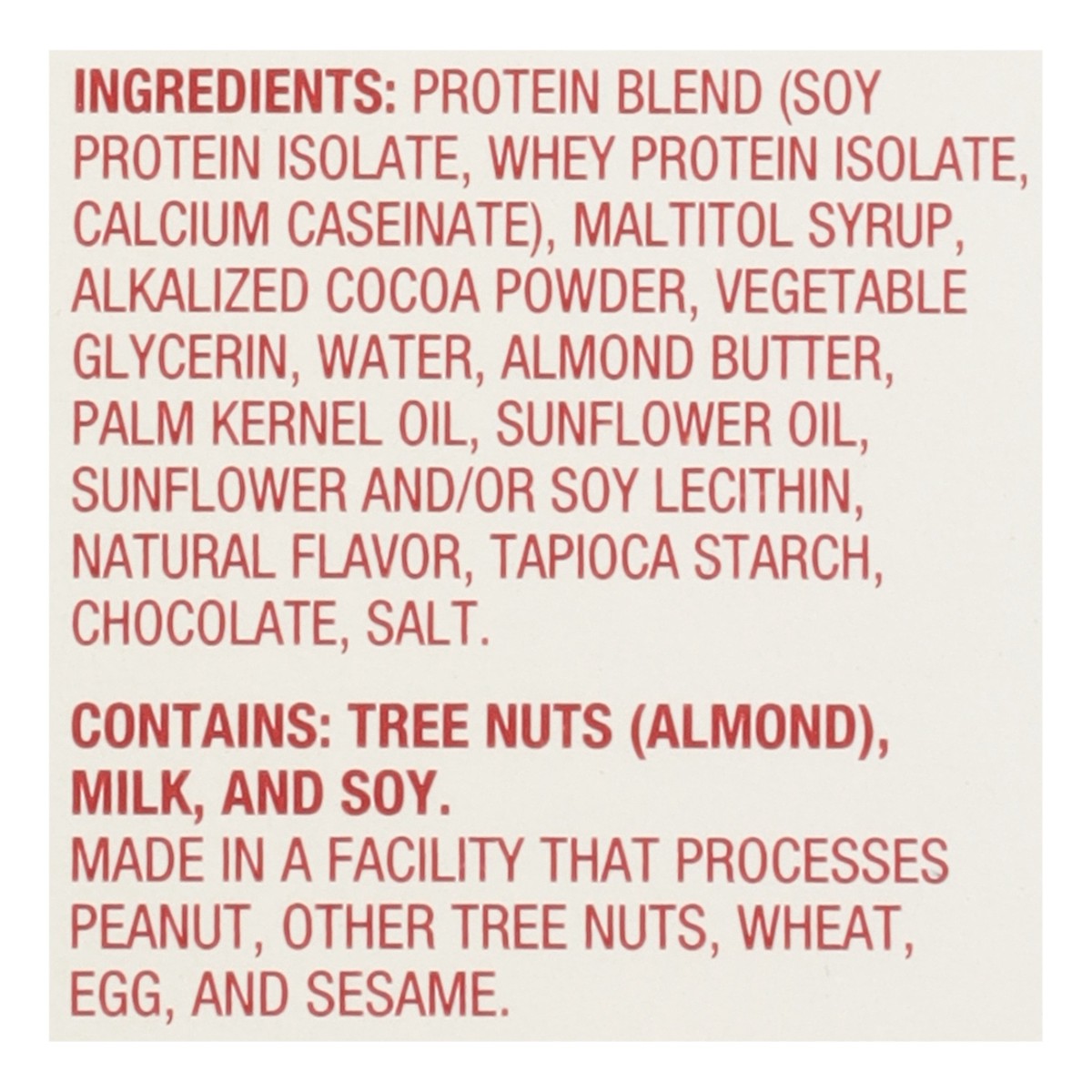 Protein Blend (Soy Protein Isolate, Whey Protein Isolate, Calcium Caseinate), Maltitol Syrup, Alkalized Cocoa Powder, Vegetable Glycerin, Water, Almond Butter, Palm Kernel Oil, Sunflower Oil, Sunflowe…