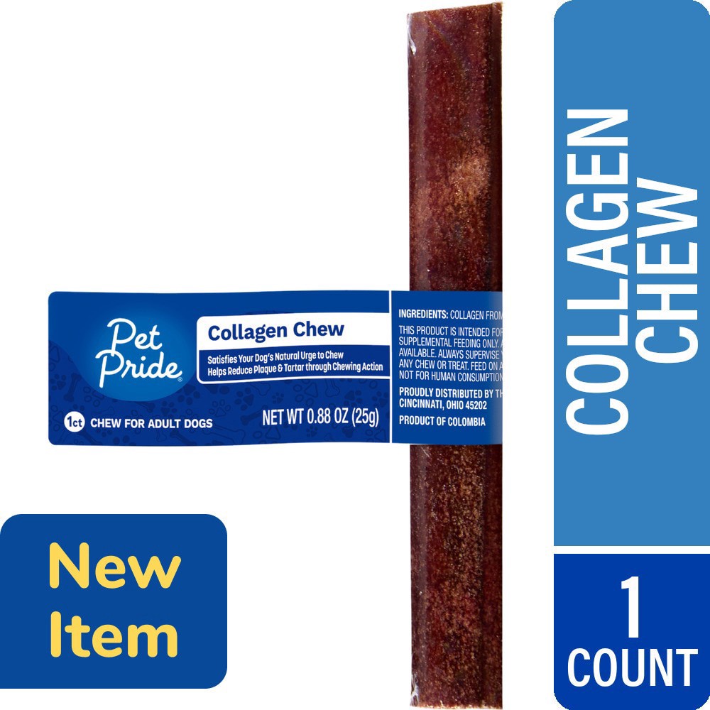 Pet Pride® Collagen Chew Adult Dog Treats is a chewy treat! Harnessing the power of collagen from beefhide, it satisfies your dog's natural urge to chew. The continuous chewing action helps reduce pla…