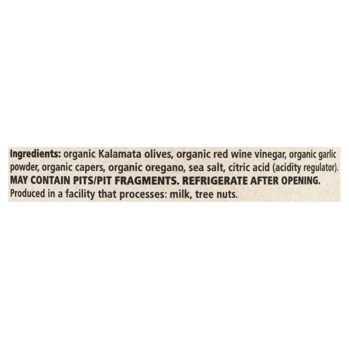 Organic Kalamata Olives, Organic Red Wine Vinegar, Organic Garlic Powder, Organic Capers, Organic Oregano, Sea Salt, Citric Acid (Acidity Regulator).