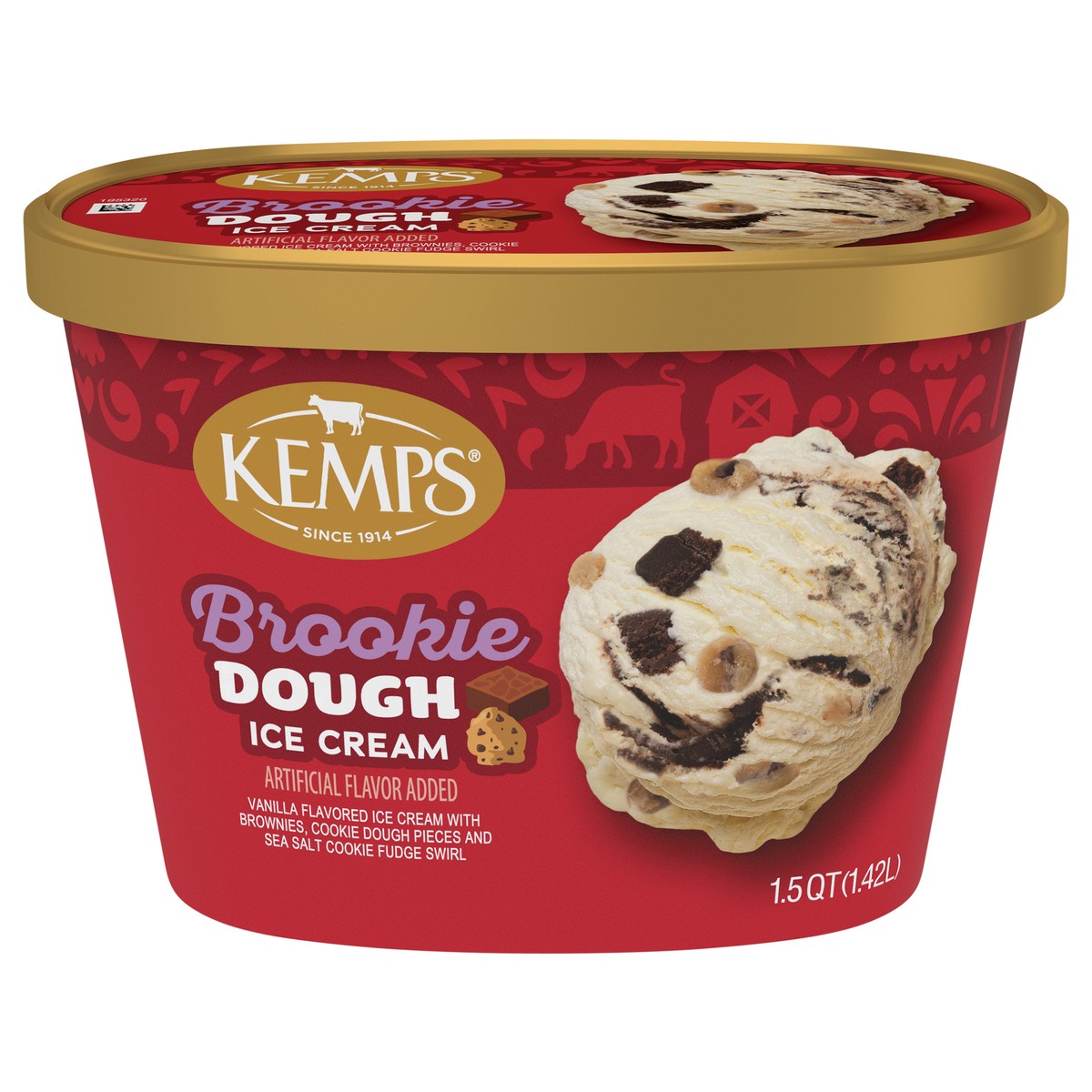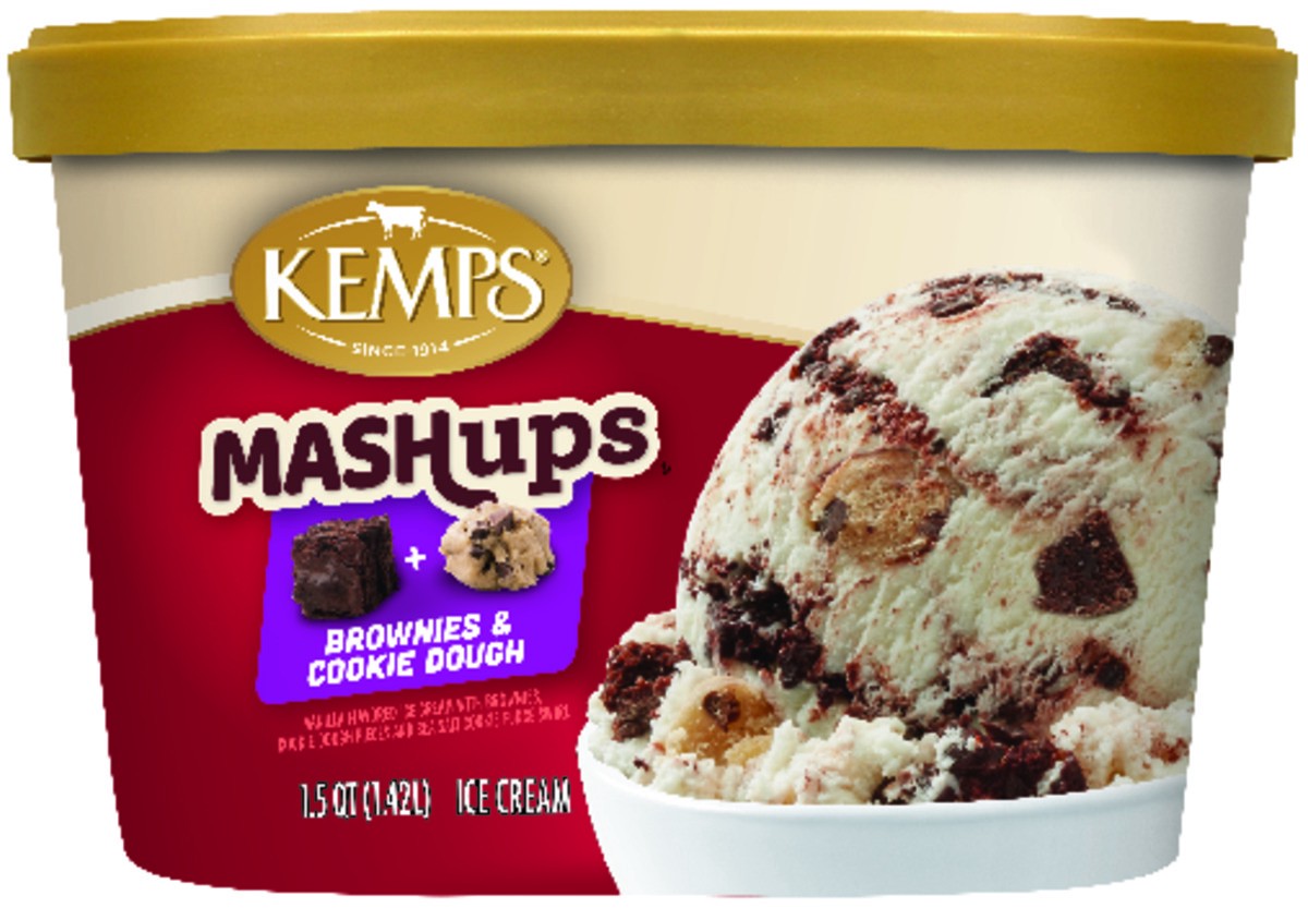 Vanilla flavored ice cream with brownies, cookie dough pieces and sea salt cookie fudge swirl.