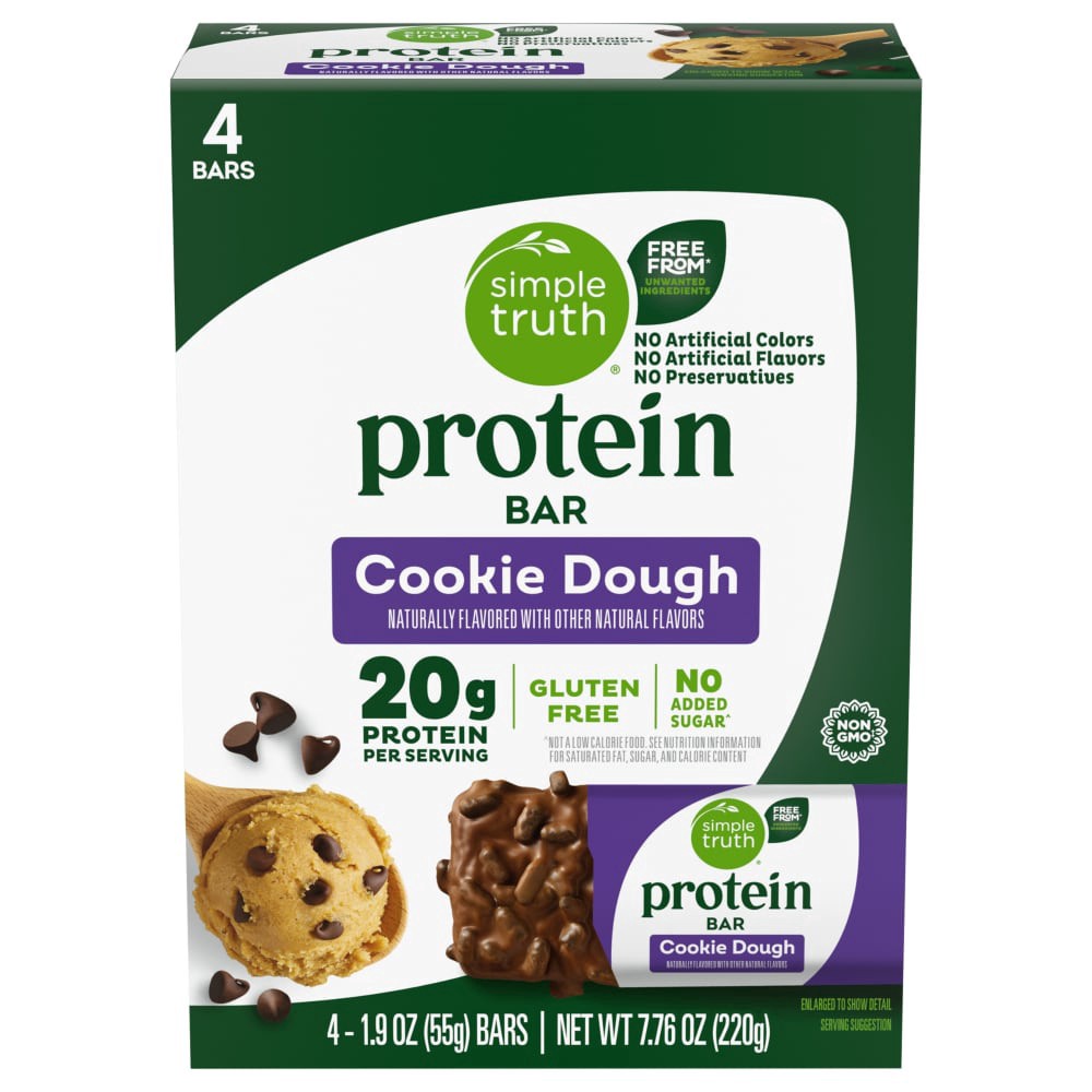 Simple Truth® Protein Cookie Dough Protein Bar is a tasty treat. These bars are non-GMO, gluten free, and preservative free with no added sugarˆ, no artificial colors, and no artificial flavors for yo…