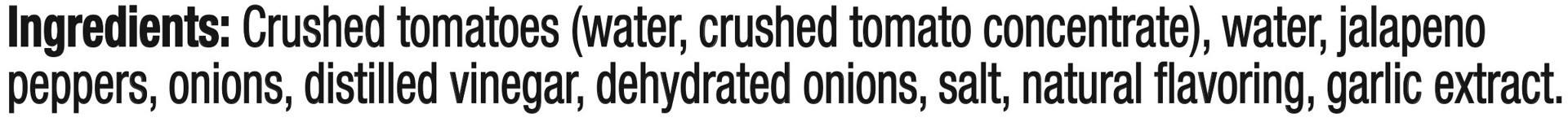 INGREDIENTS: CRUSHED TOMATOES (WATER, CRUSHED TOMATO CONCENTRATE), WATER, JALAPENO PEPPERS, ONIONS, DISTILLED VINEGAR, DEHYDRATED ONIONS, SALT, NATURAL FLAVORING, GARLIC EXTRACT.